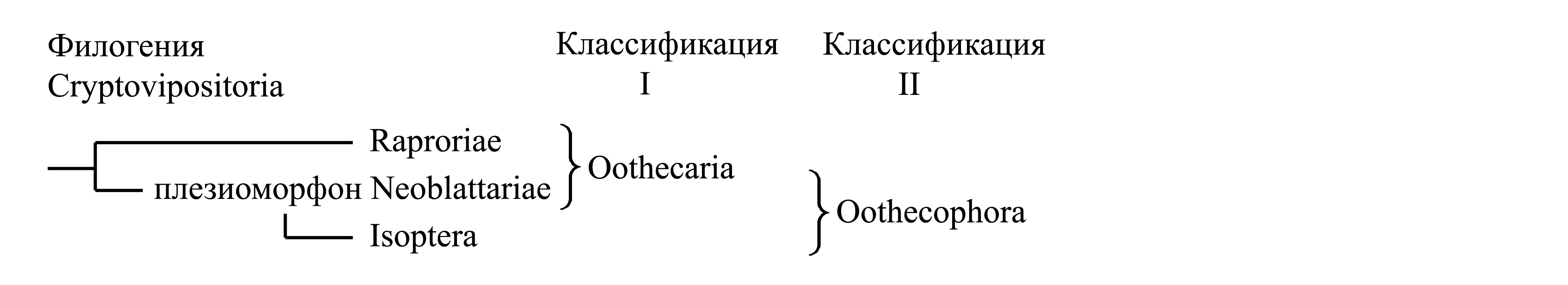 I. Деление Cryptovipositoria на Oothecaria и Isoptera. Таксон Oothecaria Verhoeff 1902b {synn.circ.: Homoneura Enderlein 1903 (интерпретация названия Nomoneura Brauer 1885) = Palaeopteradelphia Crampton 1915 = Blattoptera Schwanwitsch 1946; по циркумскрипции также соответствует: «Dictyoptera» sensu Enderlein 1904 (non Dictuoptera Leach 1815a – см. выше, комментарий к Pandictyoptera)} объединяет тараканов (Neoblattariae) и богомолов (Raptoriae). Oothecaria отличаются от Isoptera лишь симплезиоморфиями: яйца откладываются в оотеку [см. (1)] (тогда как у Isoptera оотека вестигиальная или утрачена), гениталии самца имеют три фалломера [см. Pandictyoptera (8)] (тогда как у Isoptera фалломеры редуцированы). Судя по всему, таксон Oothecaria является парафилетическим (см. II).