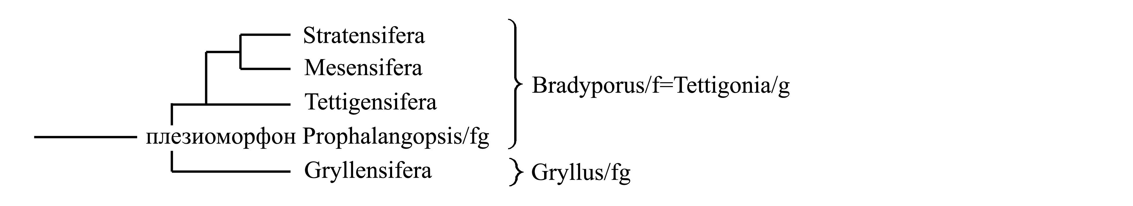 2.2.1. Плезиоморфон Prophalangopsis/fg [f:1906; g:1871], или Hagla/fg [f:1906; g:1856]. Тимпанальные слуховые органы развиты [то же у Tettigensifera и Gryllensifera; в отличие от Stratensifera – см. Dolichocera (3)]. Тегминальный стридуляционный аппарат самца имеется [см. Dolichocera (4)]; в отличие от Tettigensifera, он занимает значительную часть надкрылья и сохраняет симметричность. В отличие от Gryllensifera, лапки с перетяжками на местах слияния всех первичных тарсомеров [см. Neorchesopia (1)]; при этом число подвижных тарсомеров бывает 4 или 3. Строение яйцеклада неизвестно: типовой вид Prophalangopsis obscura известен по единственному экземпляру самца из Индии; три вида Cyphoderris Uhler 1864 (обитающие в Северной Америке) и Paracyphoderris erebeus Storozhenko 1980 (на Дальнем Востоке России) короткокрылые, с вестигиальным яйцекладом. Сюда же относят большое число вымерших мезозойских видов, в том числе Hagla gracilis; в этом случае старшим типифицированным названием всего таксона оказывается не Prophalangopsis/fg, а Hagla/fg.