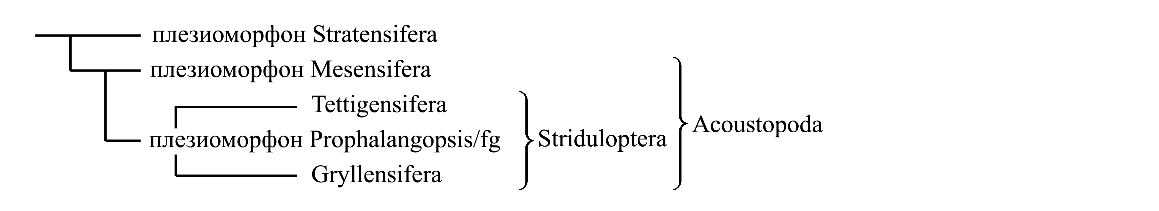 Таксон Striduloptera включает крупные голофилетические таксоны Tettigensifera и Gryllensifera; несколько видов не относятся к ним и объединяются в плезиоморфон Prophalangopsis/fg1.