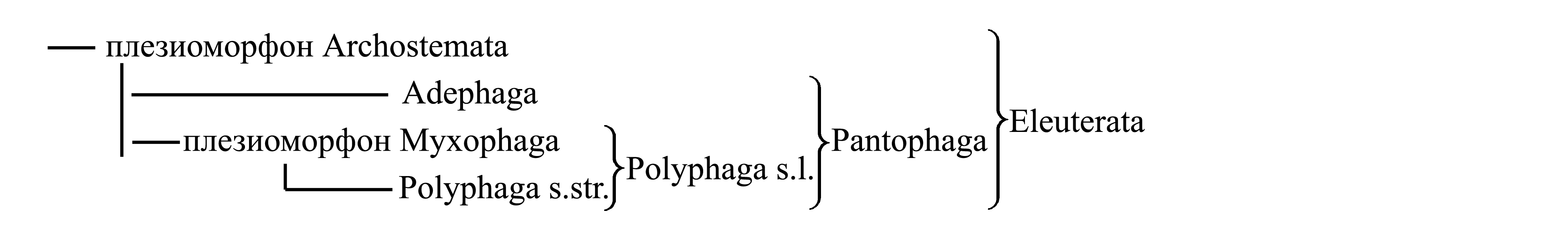 Вероятно, Archostemata представляют собой парафилетическую группу, предковую для других жуков. Было предложено объединять всех остальных жуков, кроме Archostemata, в таксон Pantophaga Klausnitzer 1975 {по циркумскрипции соответствует «Coleoptera» sensu Machatschke 1962}. Высказывалось ошибочное утверждение, что Pantophaga отличаются от Archostemata приобретением сплошной склеротизации надкрыльев, при которой жилки заполняют все надкрылье, так что ячейки сокращены до точек или совсем исчезли. В действительности этот признак эволюционирует обратимо и поэтому не может служить доказательством голофилии таксона [см. Elytrophora (6)]. По другой версии, Adephaga и Polyphaga произошли от разных вымерших Archostemata (Пономаренко 1969).