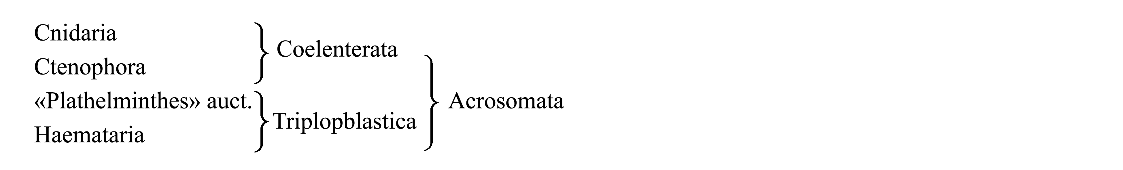 II. Деление Monostomata на Cnidaria и Acrosomata. Некоторые авторы не признают таксон Coelenterata и объединяют гребневиков, плоских червей и Haemataria в таксон Acrosomata Ax 1996 {syn.circ: Trochaeozoa Nielsen 1985 (non Trochozoa Beklemischev 1944)}, противопоставляемый Cnidaria.