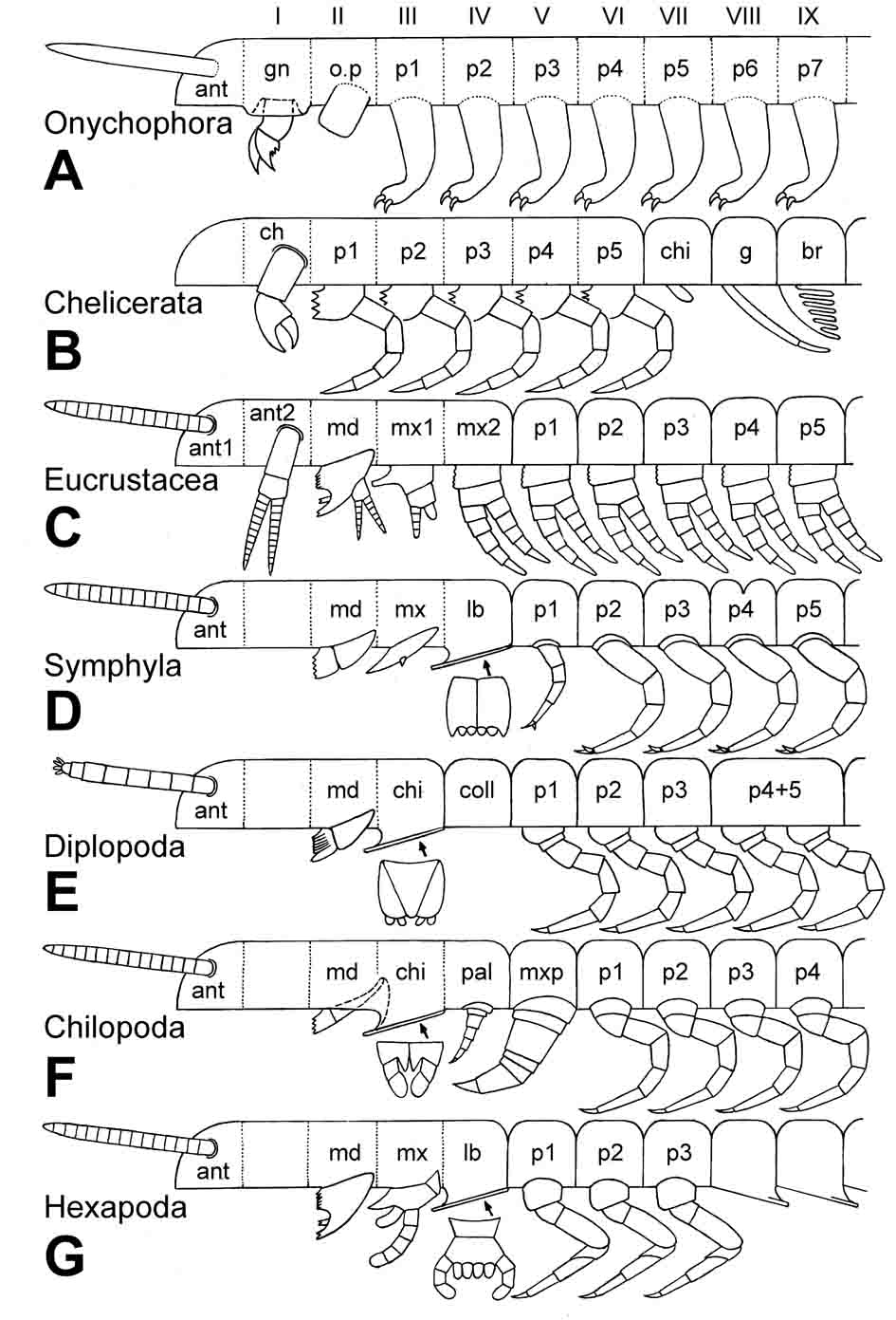 | Gnathopoda Onychophora Euarthropoda Chelicerophora Mandibulata Atelocerata Myriapoda Progoneata Symphyla Collifera Diplopoda Chilopoda Hexapoda | |||||||