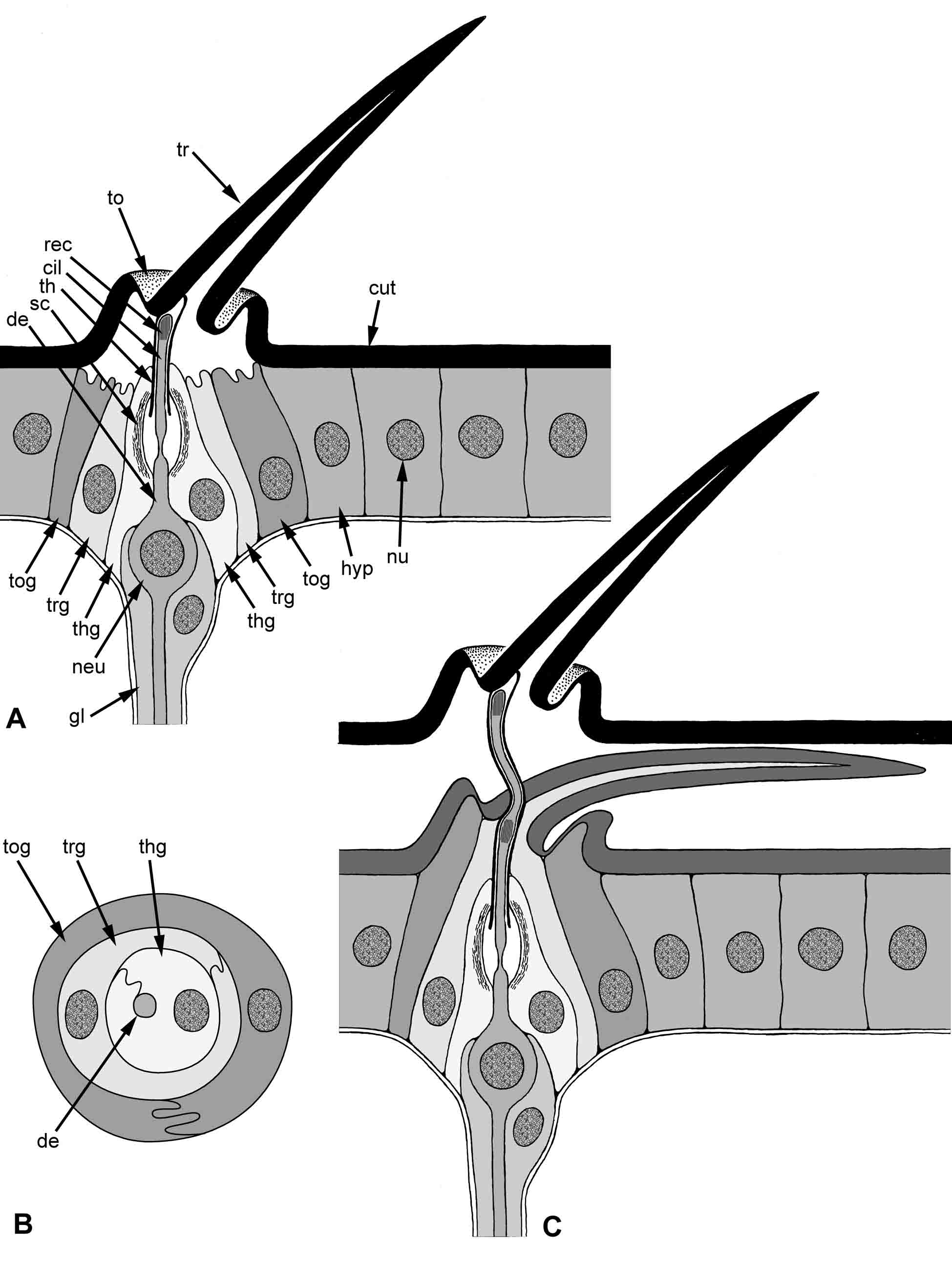 Ðèñ. 4.4.1. Ñðåçû àðòðîïîäíîé ùåòèíêè (êëåòêè ïî-ðàçíîìó çàòåìíåíû ñåðûì, ÿäðà çàòåìíåíû îðíàìåíòîì): A – ðàçðåç ó÷àñòêà ïîêðîâà ñ ïðîäîëüíûì ðàçðåçîì ùåòèíêè è íåéðîíà; B – òî æå, ïîïåðå÷íûé ðàçðåç îáîëî÷å÷íûõ êëåòîê è äåíäðèòà; C – ðàçðåç ó÷àñòêà ïîêðîâà è ùåòèíêè ïåðåä ëèíüêîé íà ñëåäóþùèé âîçðàñò (ñòàðàÿ êóòèêóëà ïîêàçàíà ÷åðíûì, íîâàÿ êóòèêóëà ïîêàçàíà òåìíî-ñåðûì). Óñëîâíûå îáîçíà÷åíèÿ: cil – ñåíñîðíàÿ ðåñíè÷êà; cut – êóòèêóëà; de – äåíäðèò ñåíñîðíîé êëåòêè; gl – ãëèàëüíàÿ êëåòêà; hyp – ãèïîäåðìàëüíàÿ êëåòêà; neu – ñåíñîðíàÿ êëåòêà; nu – êëåòî÷íîå ÿäðî; rec – ðåöåïòîðíûé ó÷àñòîê ðåñíè÷êè; sc – ñêîëîïc, îêðóæàþùèé öèëèàðíûé ñèíóñ; th – êóòèêóëÿðíûé ôóòëÿð ðåñíè÷êè; thg – òåêîãåííàÿ êëåòêà; to – ñî÷ëåíîâíàÿ ìåìáðàíà ùåòèíêè; tog – òîðìîãåííàÿ êëåòêà; tr – ùåòèíêà; trg – òðèõîãåííàÿ êëåòêà.