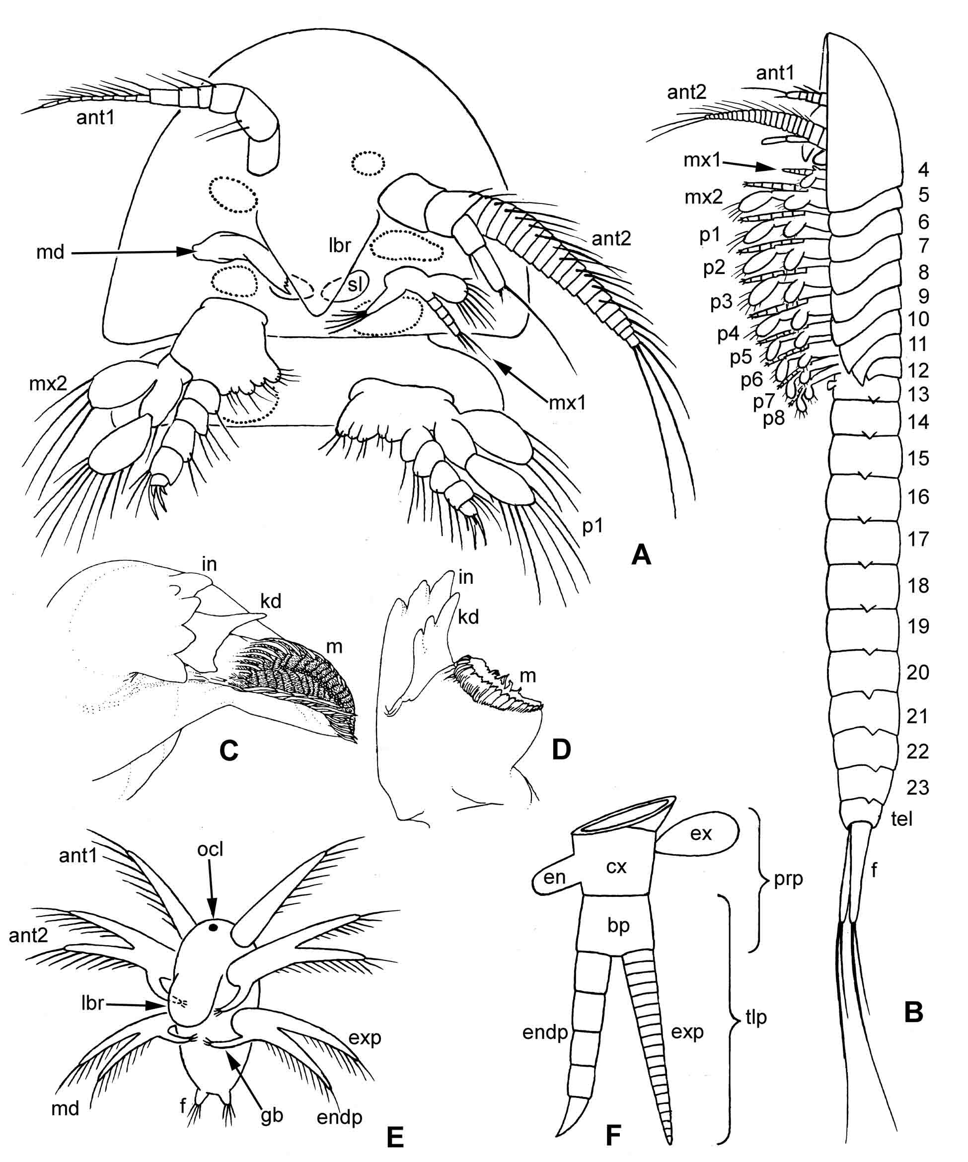 Ðèñ. 4.7.1. Eucrustacea. A–B – Cephalocarida: A – Lightiella incisa Gooding 1963, ãîëîâà è ïåðâûé ñåãìåíò ãðóäè âåíòðàëüíî; ñ ïðàâîé ñòîðîíû æèâîòíîãî (ëåâàÿ ñòîðîíà ðèñóíêà) óäàëåíû àíòåííà II, ìàêñèëëà I è ïåðâàÿ ãðóäíàÿ íîãà; ñ ëåâîé ñòîðîíû æèâîòíîãî (ïðàâàÿ ñòîðîíà ðèñóíêà) óäàëåíû àíòåííà I, ìàíäèáóëà è ìàêñèëëà II; ìåñòà ïðèêðåïëåíèÿ óäàëåííûõ ïðèäàòêîâ ïîêàçàíû ïóíêòèðíîé ëèíèåé (ñõåìà íà îñíîâå ðèñóíêà èç Gooding 1963). B – Hutchinsoniella macracantha Sanders 1955, ñáîêó (ñõåìà íà îñíîâå ðèñóíêà èç Hessler & Newmann 1975). C–D – Remipedia: Lasionectes entrichoma Yager & Schram 1986, ìàíäèáóëû (ïî Yager & Schram 1986). E – ñõåìà ñòðîåíèÿ íàóïëèóñà. F – ñõåìà ñòðîåíèÿ äâóâåòâèñòîé êîíå÷íîñòè Eucrustacea. Óñëîâíûå îáîçíà÷åíèÿ: 4–23 – V–XXIII ïîñòîðàëüíûå ñåãìåíòû; ant1 – àíòåííà I; ant2 – àíòåííà II; bp – áàçèïîäèò; cx – êîêñîïîäèò; gb – ãíàòîáàçà; end – ýíäèò; endp – ýíäîïîäèò; ex – ýêçèò; exp – ýêçîïîäèò; f – ôóðêà; in – èíöèçîð; kd – êèíåòîäîíò; lbr – âåðõíÿÿ ãóáà; m – ìîëà; md – ìàíäèáóëà; mx1 – ìàêñèëëà I; mx2 – êîíå÷íîñòü, ãîìîëîãè÷íàÿ ìàêñèëëå II; ocl – íàóïëèàëüíûé ãëàç; p1-p8 – ãðóäíûå íîãè I–VIII ïàð; pcx – ïðåêîêñà; prp – ïðîòîïîäèò; sl – ïàðàãíàòà (ñóïåðëèíãâà); tel – òåëüñîí; tlp – òåëîïîäèò.