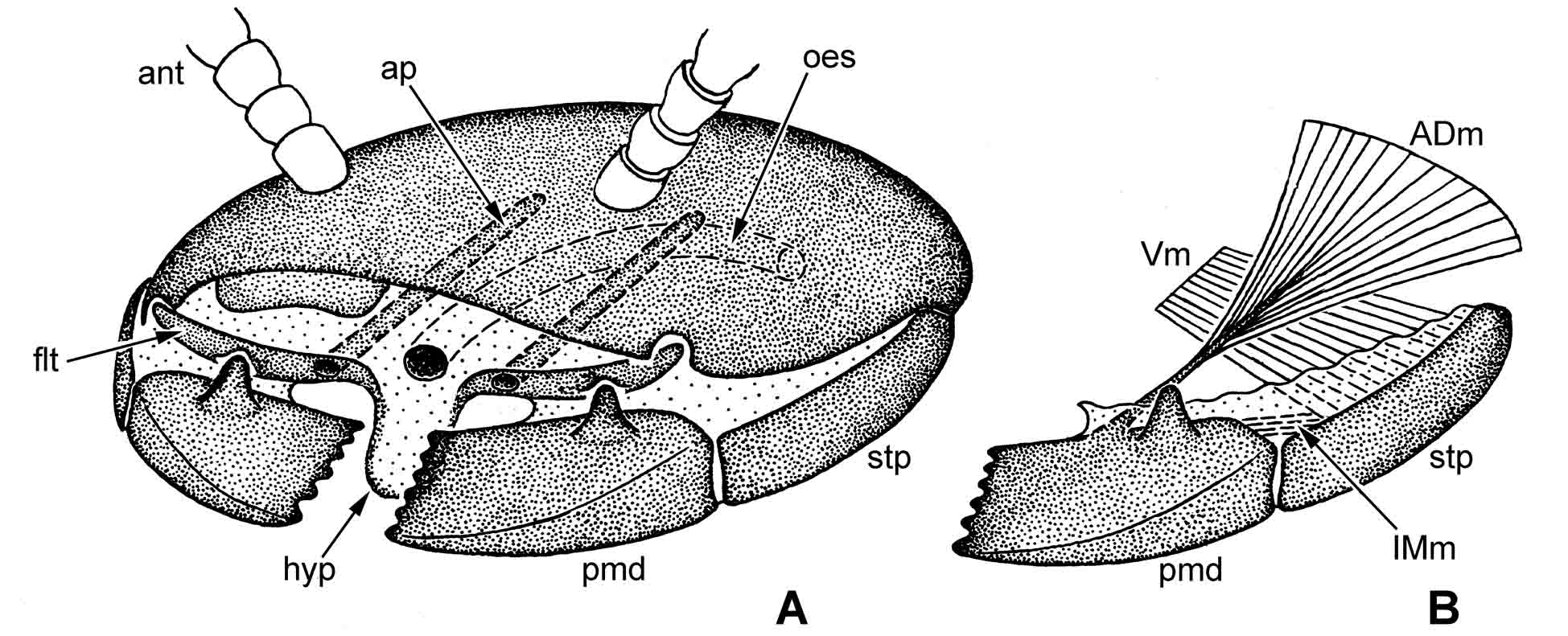 Рис. 5.1. Схема строения мандибул Myriapoda. A – головная капсула, фультуры и мандибулы; показано положение пищевода; B – отдельная левая мандибула с мускулатурой. Условные обозначения: ADm – передняя дорсальная мышца мандибулы; ant – антенна; ap – аподема фультуры; flt – фультура; hyp – гипофаринкс; IMm – внутримандибулярная мышца; pmd – премандибула; oes – пищевод; stp – стипес; Vm – вентральная мышца мандибулы.