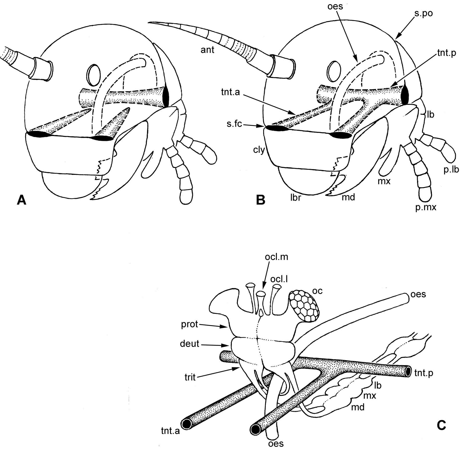 Ðèñ. 6.6.2. Òåíòîðèóì ó Amyocerata. A–B – ïîëîæåíèå òåíòîðèóìà â ãîëîâíîé êàïñóëå: A – Triplura, B – Pterygota. C – âçàèìîðàñïîëîæåíèå òåíòîðèóìà, ïèùåâîäà è öåíòðàëüíîé íåðâíîé ñèñòåìû. Óñëîâíûå îáîçíà÷åíèÿ: ant – àíòåííà; cly – êëèïåóñ (íàëè÷íèê); deut – äåéòîöåðåáðóì; s.fc – ôðîíòîêëèïåàëüíûé øîâ; lb – íèæíÿÿ ãóáà è ãàíãëèé ëàáèàëüíîãî ñåãìåíòà; lbr – âåðõíÿÿ ãóáà; md – ìàíäèáóëà è ãàíãëèé ìàíäèáóëÿðíîãî ñåãìåíòà; mx – ìàêñèëëà è ãàíãëèé ìàêñèëëÿðíîãî ñåãìåíòà; oc – ôàñåòî÷íûé ãëàç; ocl.l – ëàòåðàëüíûé ïðîñòîé ãëàçîê; ocl.m – ìåäèàëüíûé ïðîñòîé ãëàçîê; oes – ïèùåâîä; p.lb – ëàáèàëüíûé ùóïèê; p.mx – ìàêñèëëÿðíûé ùóïèê; prot – ïðîòîöåðåáðóì; s.po – ïîñòîêöèïèòàëüíûé øîâ; tnt.a – ïåðåäíèå ðóêè òåíòîðèóìà; tnt.p – çàäíèå ðóêè òåíòîðèóìà; trit – òðèòîöåðåáðóì.