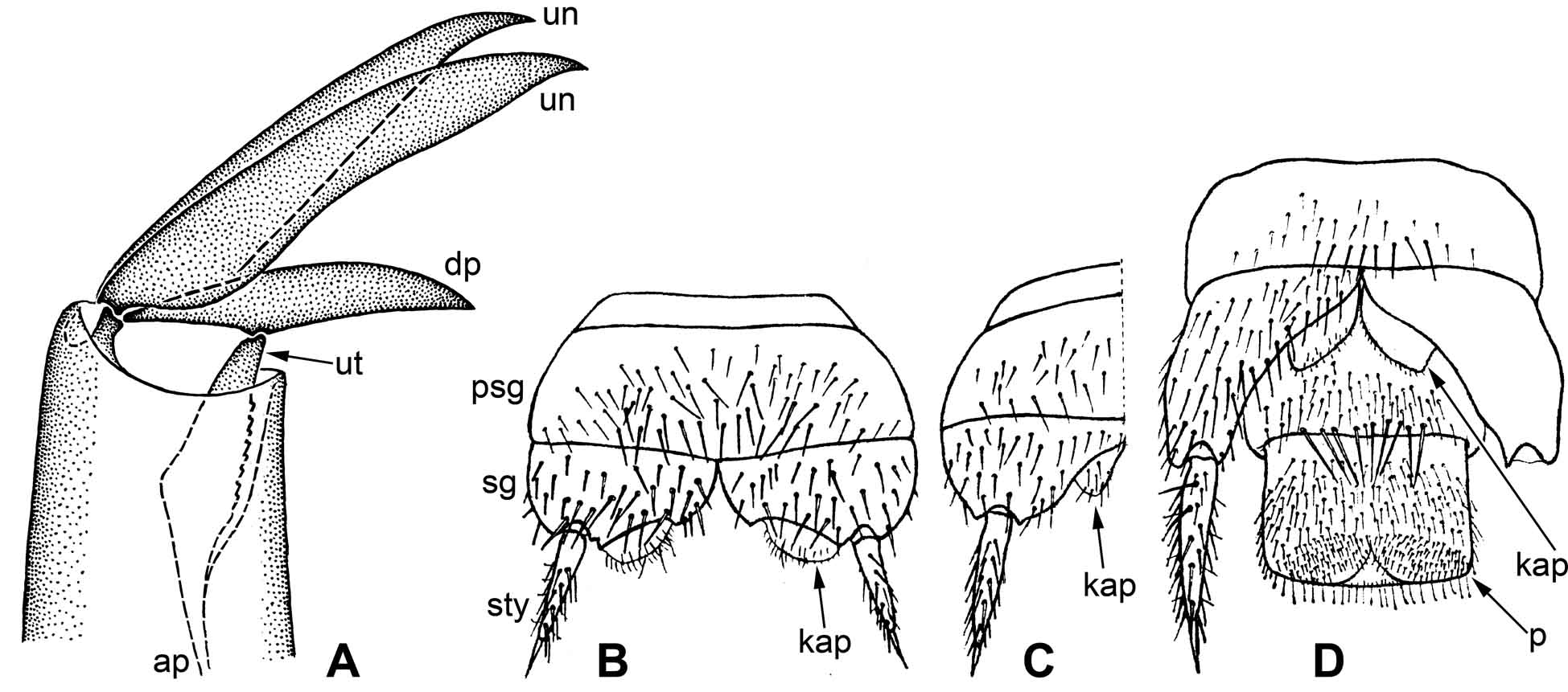 Ðèñ. 6.7.3. Zygentoma. A – Thermobia domestica (Packard 1873 [Lepisma]), âåðøèíà ëàïêè è ïðåòàðñóñ. B–D – Tricholepidion gertschii Wygodzinsky 1961 (ïî Wygodzinsky 1961): VII, VIII è IX ñåãìåíòû áðþøêà ñàìöà, âåíòðàëüíî. Óñëîâíûå îáîçíà÷åíèÿ: ap – àïîäåìà ïðåòàðñóñà; dp – ïåðâè÷íûé ñðåäèííûé êîãîòîê (äàêòèëîïîäèò); kap – êèíåòàïîôèç; p – ïåíèñ; psg – ïðåñòèëèãåð; sg – ñòèëèãåð; sty – ñòåðíîñòèëü; un – áîêîâîé êîãîòîê; ut – óíãóèòðàêòîð.