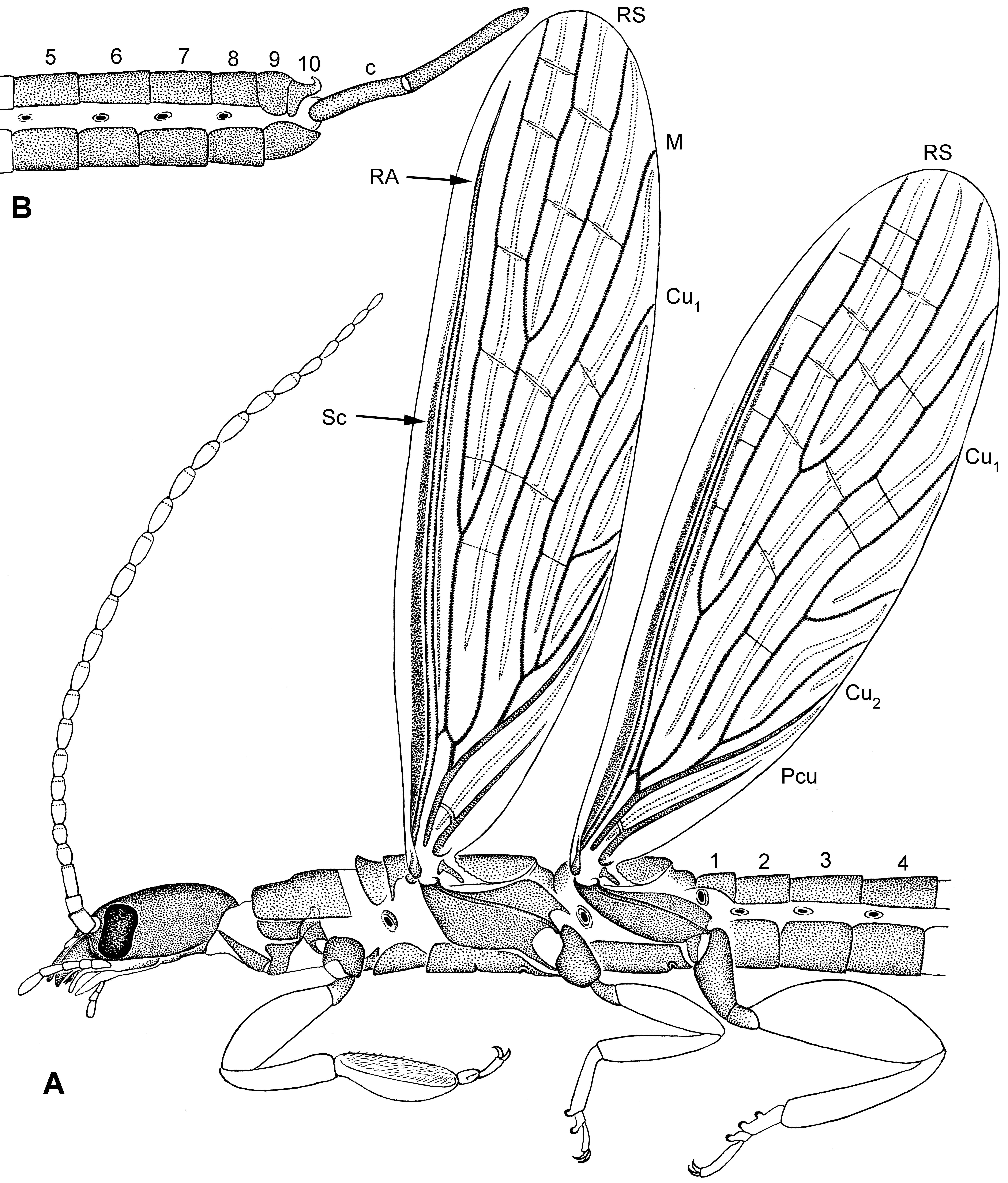 Ðèñ. 8.2.1. Embioptera. Clothoda amazonica Kluge 2012, ñàìåö èìàãî, ëàòåðàëüíî (ùåòèíêè íå íàðèñîâàíû). Óñëîâíûå îáîçíà÷åíèÿ: 1–10 – ñåãìåíòû áðþøêà; c – öåðê.