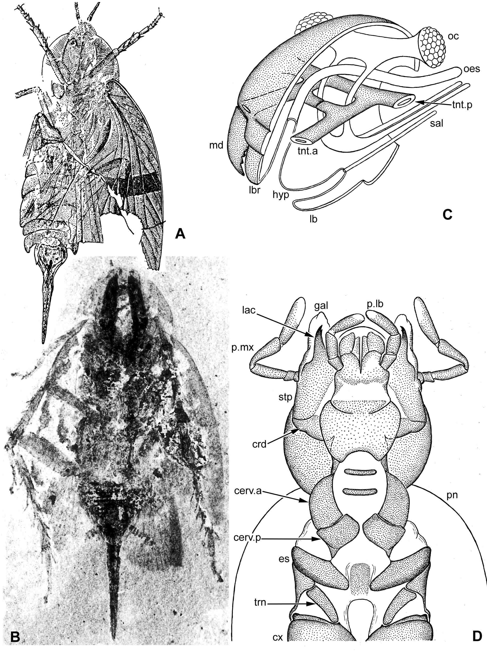 Ðèñ. 8.4.1. Pandictyoptera. A–B – Palaeoblattariae: A – Kunguroblattina microdictya Becker-Migdisova & Vishjakova 1962 (ïî Ðîäåíäîðô 1962); B – Uraloblatta insignis G. Zalessky 1939 (ïî Rasnitsyn & Quicke 2002). C – ñõåìàòè÷íûé ïðîäîëüíûé ñðåç ãîëîâíîé êàïñóëû Pandictyoptera (ïîâåðõíîñòü è òåíòîðèóì ïóíêòèðîâàíû). D – Blatta orientalis Linnaeus 1758: âåíòðàëüíàÿ ñòîðîíà ãîëîâû, øåè è ïåðåäíåé ÷àñòè ïåðåäíåãðóäè. Óñëîâíûå îáîçíà÷åíèÿ: cerv.a – ïåðåäíèé öåðâèêàëüíûé ñêëåðèò; cerv.p – çàäíèé öåðâèêàëüíûé ñêëåðèò; crd – êàðäî; cx – òàçèê ïåðåäíåé íîãè; es – ýïèñòåðíóì ïåðåäíåãðóäè; gal – ãàëåà ìàêñèëëû; hyp – ãèïîôàðèíêñ; lac – ëàöèíèÿ ìàêñèëëû; lbr – âåðõíÿÿ ãóáà; md – ìàíäèáóëà; oc – ãëàç; oes – ïèùåâîä; p.lb – ëàáèàëüíûé ùóïèê; p.mx – ìàêñèëëÿðíûé ùóïèê; pn – ïðîíîòóì; sal – ïðîòîê ñëþííîé æåëåçû; stp – ñòèïåñ ìàêñèëëû; trn – òðîõàíòèí; tnt.a – ïåðåäíÿÿ ðóêà òåíòîðèóìà; tnt.p – çàäíÿÿ ðóêà òåíòîðèóìà.