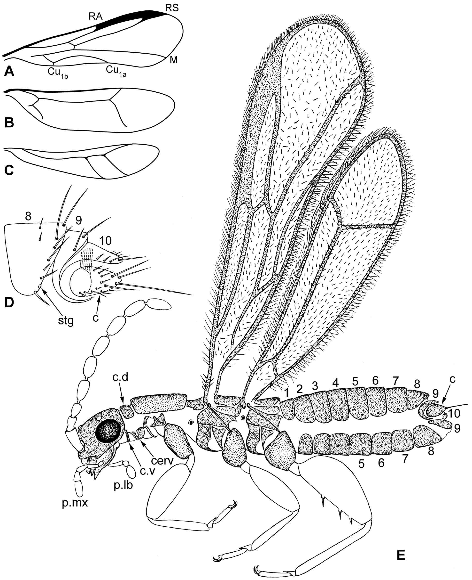 Ðèñ. 9.1.2. Zoraptera: èìàãî êðûëàòîé ôîðìû. A–B – ïåðåäíåå è çàäíåå êðûëüÿ Zorotypus amazonensis Rafael & Engel 2006; C – çàäíåå êðûëî Xenozorotypus burmiticus Engel & Grimaldi 2002; D–E – Zorotypus huxleyi Bolivar y Pieltain & Coronado 1963: D – VIII–X òåðãèòû áðþøêà (ìûøöû öåðêà ïîêàçàíû ïðåðûâèñòûìè ëèíèÿìè); E – êðûëàòàÿ ôîðìà, ñàìêà èìàãî (èç ùåòèíîê íàðèñîâàíû òîëüêî êðàåâûå è âåíòðàëüíûå ùåòèíêè êðûëüåâ è àïèêàëüíàÿ ùåòèíêà öåðêà; ïðî÷èå ùåòèíêè ãîëîâû, òóëîâèùà, íîã è öåðêîâ íå íàðèñîâàíû). Óñëîâíûå îáîçíà÷åíèÿ: 1–10 – ñåãìåíòû áðþøêà; c – öåðê; c.d – äîðñàëüíûé öåðâèêàëüíûé ñêëåðèò; c.v – âåíòðàëüíûé ïîïåðå÷íî-äóãîâèäíûé ñêëåðèò; p.lb – ëàáèàëüíûé ùóïèê; p.mx – ìàêñèëëÿðíûé ùóïèê; stg – äûõàëüöå VIII ñåãìåíòà áðþøêà.