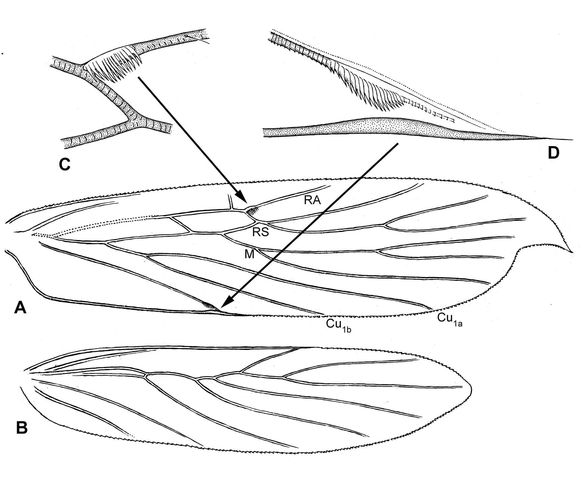 Ðèñ. 9.2.5. Parapsocida: Papuapsocus sp.: A–B – ïðàâûå ïåðåäíåå è çàäíåå êðûëüÿ, âåíòðàëüíî; Ñ – ñòèãìàïîôèç; D – íîäóëþñ.
