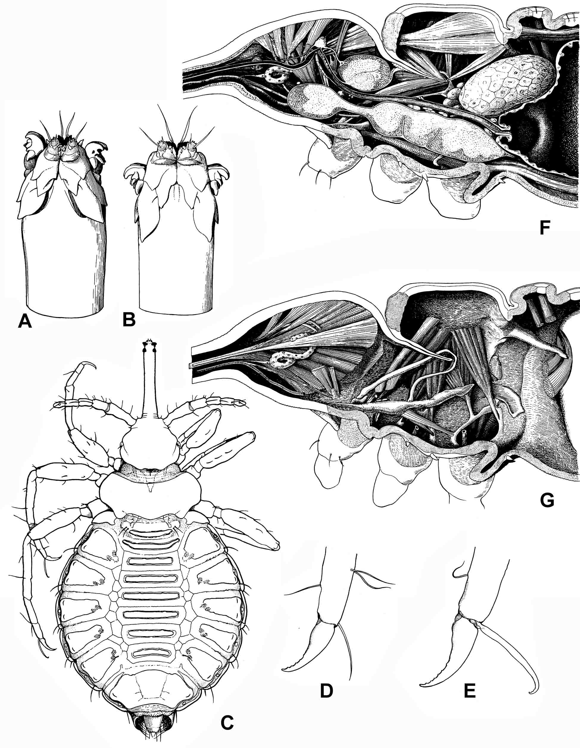 Ðèñ. 9.3.4. Rhyncophthirina: Haematomyzus elephantis Piaget 1869, ñàìêà èìàãî. A–B – âåðøèíà ãîëîâîòðóáêè, âåíòðàëüíî, ñ ðàçäâèíóòûìè è ñäâèíóòûìè ìàíäèáóëàìè; Ñ – îáùèé âèä, äîðñàëüíî; D – êîãîòîê ïåðåäíåé íîãè; E – êîãîòêè ñðåäíåé íîãè; F – ìåäèàëüíûé ïðîäîëüíûé ñðåç ïðîêñèìàëüíîé ÷àñòè ãîëîâû è ãðóäè; G – òî æå, ÷àñòü îðãàíîâ óäàëåíà (ïî Weber 1969, óïðîùåíî).