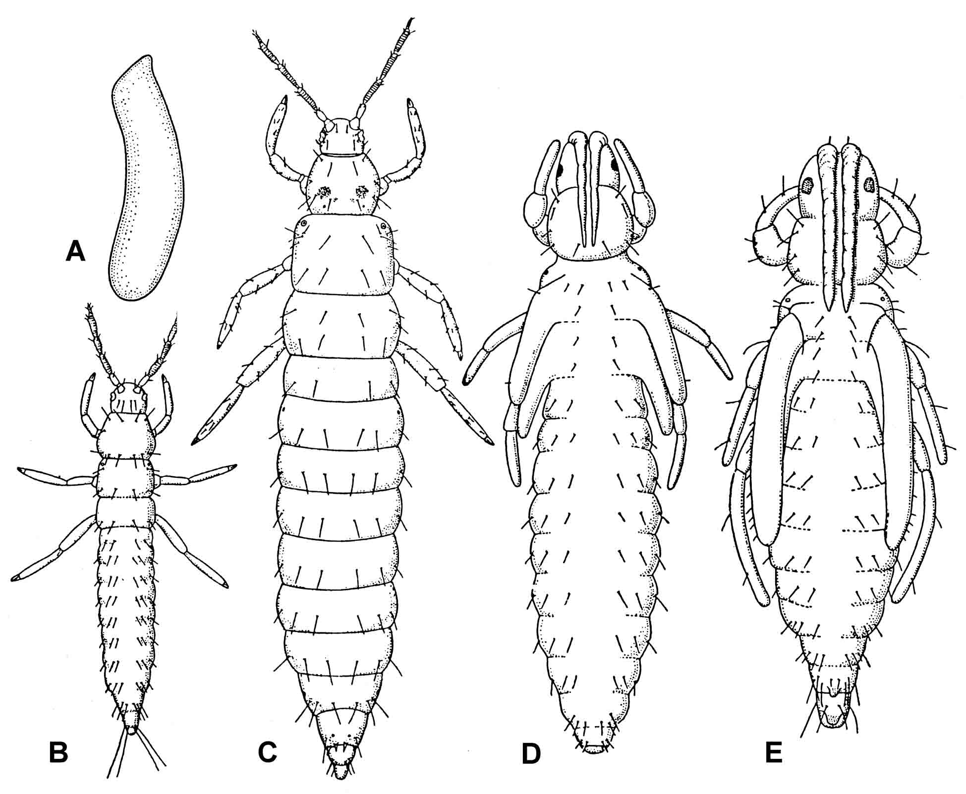 Рис. 9.5.3. Thysanoptera-Terebrantia: Aeolothrips intermedius Bagnall 1934: яйцо и личинки I–IV возрастов (по Дербеневой 1967).