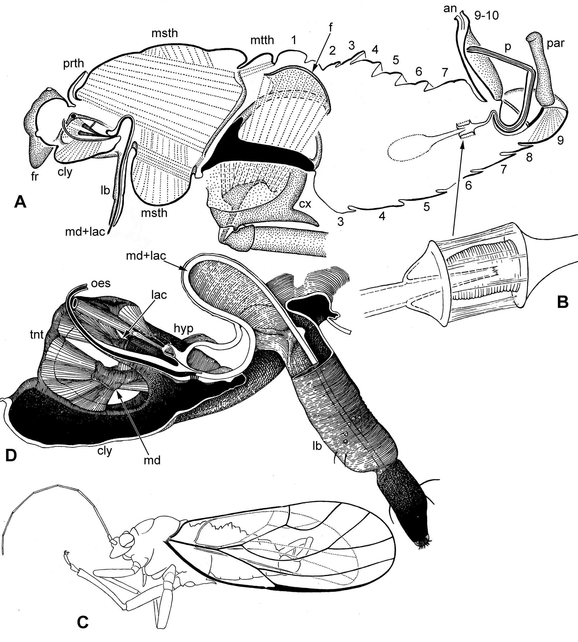 Рис. 9.9.2. Saltipedes: A–C – Psylla alni (Linnaeus 1758 [Chermes]). A – медиальный срез самца имаго (срез кутикулы показан черным; поверхности, находящиеся позади среза, пунктированы; пунктиром показаны следующие мышцы: клипео-цибариальная мышца (расширитель глоточного насоса), ретракторы стилетов, главные мышцы среднегруди, продольная спинная мышца заднегруди, фуркально-вертлужные прыгательные мышцы заднегруди, мышцы семенного насоса, мышца парамера; остальные мышцы не показаны); B – увеличенный семенной насос; C – самец имаго со сложенными крыльями, вид сбоку, задняя нога вытянута в результате максимального сокращения прыгательных мышц. D – Cacopsylla mali (Schmidberger 1836 [Chermes]), медиальный срез части головы с ротовым аппаратом; клипео-цибариальная мышца удалена, так что на заднем плапне видна правая половина тенториума, втянутые основания правой мандибулы и правой максиллярной лацинии, ретракторы и протрактор мандибулы, ретактор лацинии и мышцы гипофаринкса; внешний хоботок не разрезан (по Weber 1929, с изменениями). Условные обозначения: 1–10 – тергиты и стерниты I–X сегментов брюшка; an – анальное отверстие; cly – наличник; fr – лоб; lac – лациния максиллы; lb – внешний хоботок; md – мандибула; md+lac – внутренний хоботок; msth – среднгегрудь; mtth – заднегрудь; oes – пищевод; p – пенис; par – правый парапрокт; prth – переднегрудь; tnt – тенториум.