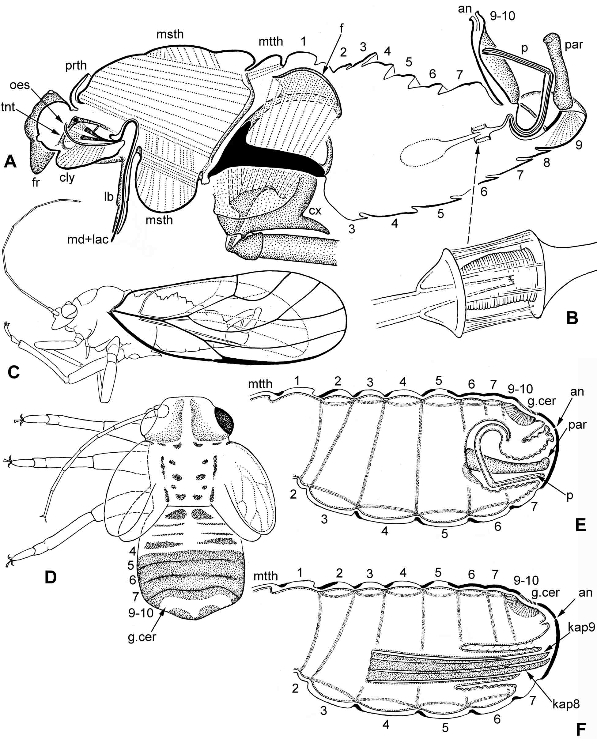 Рис. 9.9.2. Saltipedes: Psylla alni (Linnaeus 1758 [Chermes]). A – медиальный срез самца имаго (срез кутикулы показан черным; поверхности, находящиеся позади среза, пунктированы; пунктиром показаны следующие мышцы: клипео-цибариальная мышца (расширитель глоточного насоса), ретракторы стилетов, главные мышцы среднегруди, продольная спинная мышца заднегруди, фуркально-вертлужные прыгательные мышцы заднегруди, мышцы семенного насоса, мышца парамера; остальные мышцы не показаны); B – увеличенный семенной насос; C – самец имаго со сложенными крыльями. D – личинка последнего возраста (склериты пунктированы; точечными линиями показаны жилки на правом переднем протоптероне). E – медиальный срез брюшка личинки самца перед линькой на имаго; показаны продольные и дорсовентральные сегментарные мышцы, впячивания имагинальных покровов и мышца правого парамера; остальные детали внутреннего строения не показаны (простая сплошная линия – отслоившаяся личиночная кутикула, черные утолщения на ней – личиночные склериты; сплошная линия с пунктировкой – имагинальный покров; тройная пунктирная линия – мышцы; веерообразные пунктирные линии – гиподерма воскоотделительной железы; поверхность правого парамера, находящегося за плоскостью среза, пунктирована); F – медиальный срез брюшка личинки самки перед линькой на имаго (поверхности правых кинетапофизов и стилигера, находящихся за плоскостью среза, пунктирована; остальные обозначения как на рис. E). Условные обозначения: 1–10 – тергиты и стерниты I–X сегментов брюшка; an – анальное отверстие; cly – наличник; fr – лоб; b – внешний хоботок; g.cer – восковая железа; kap8, kap9 – кинетапофизы VIII и IX пар (1-я и 2-я створки яйцеклада);md+lac – внутренний хоботок; msth – среднегрудь; mtth – заднегрудь; oes – пищевод; p – пенис; par – правый парамер; prth – переднегрудь; tnt – тенториум.