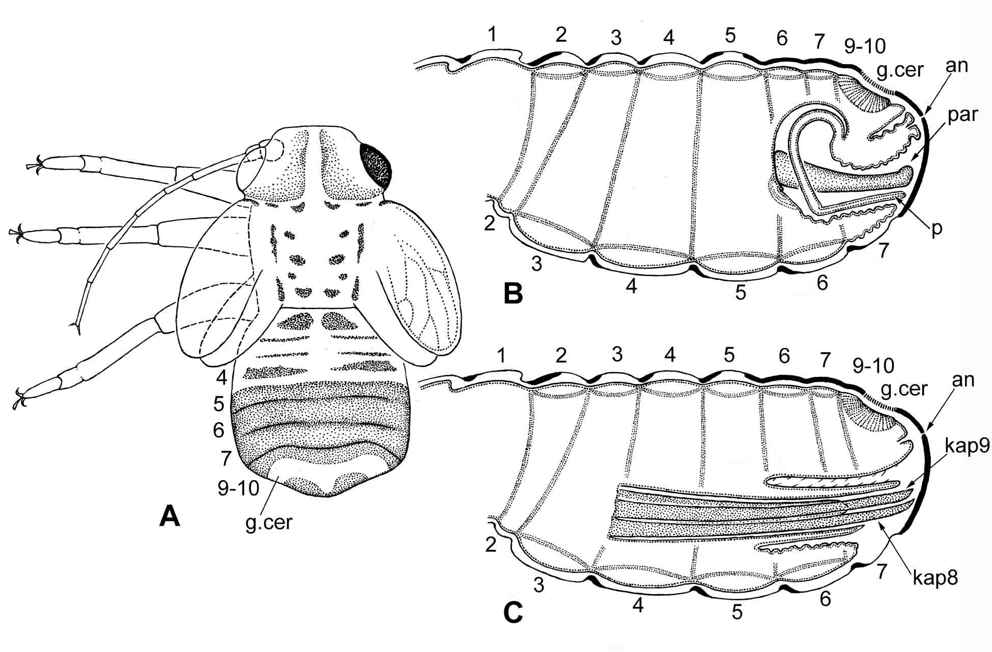 Рис. 9.9.3. Saltipedes: Psylla alni (Linnaeus 1758 [Chermes]), личинка. A – личинка последнего возраста (склериты пунктированы; точечными линиями показаны жилки на правом переднем протоптероне; слева прерывистыми линиями показаны детали, скрытые протоптеронами). B – медиальный срез брюшка личинки самца перед линькой на имаго; показаны продольные и дорсовентральные сегментарные мышцы, впячивания имагинальных покровов и мышца правого парамера; остальные детали внутреннего строения не показаны (простая сплошная линия – отслоившаяся личиночная кутикула, черные утолщения на ней – личиночные склериты; сплошная линия с пунктировкой – имагинальный покров; тройная пунктирная линия – мышцы; веерообразные пунктирные линии – гиподерма воскоотделительной железы; поверхность правого парамера, находящегося за плоскостью среза, пунктирована); C – медиальный срез брюшка личинки самки перед линькой на имаго (поверхности правых кинетапофизов и стилигера, находящихся за плоскостью среза, пунктирована; остальные обозначения как на рис. B). Условные обозначения: 1–10 – тергиты и стерниты I–X сегментов брюшка; an – анальное отверстие; g.cer – восковая железа; kap8, kap9 – кинетапофизы VIII и IX пар (1-я и 2-я створки яйцеклада); p – пенис; par – правый парамер.
