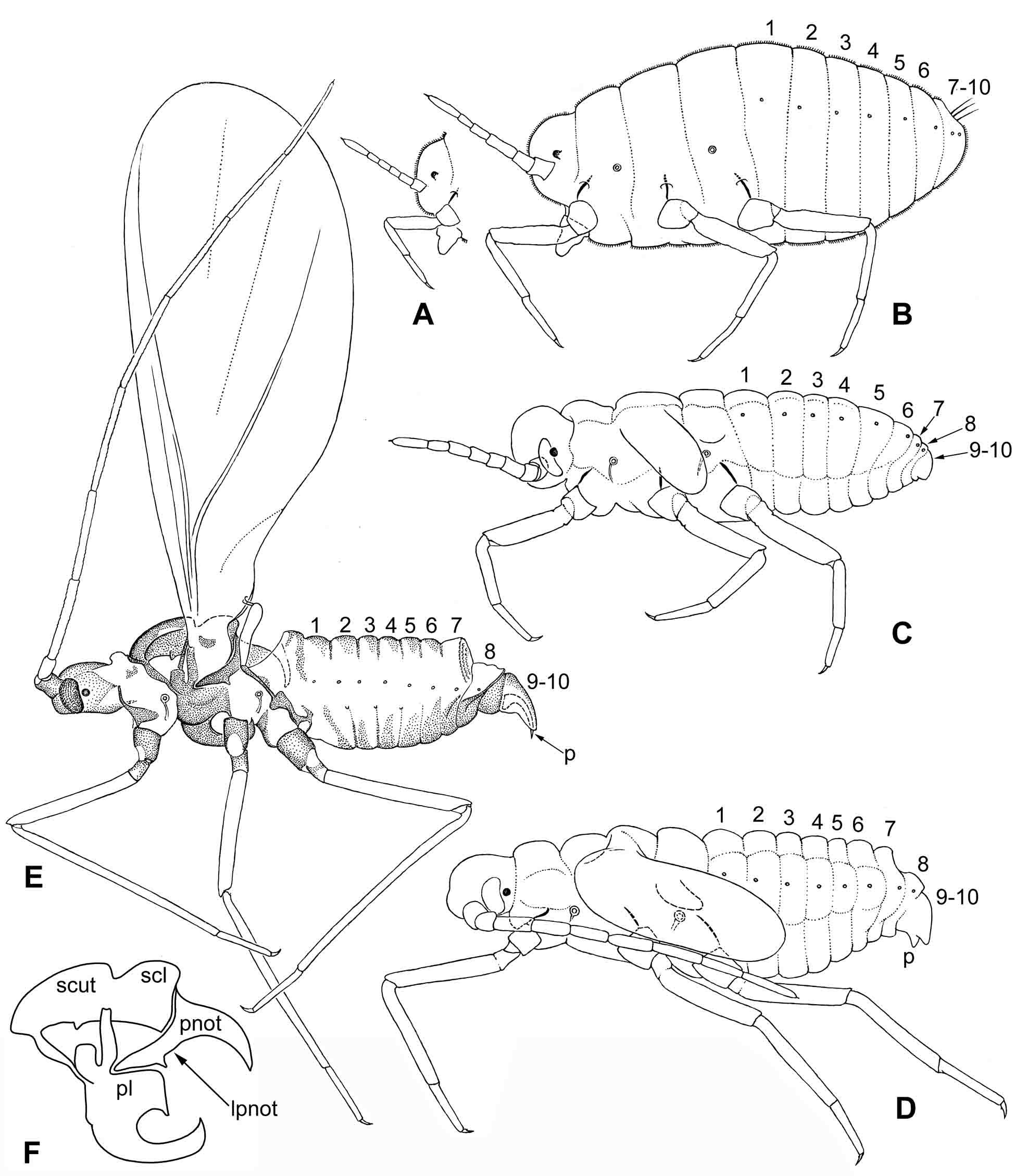 Ðèñ. 9.12.1. Gallinsecta: Orthezia urticae (Linnaeus 1758 [Aphis]), ñòàäèè îíòîãåíåçà ñàìöà: A–B – ïîäâèæíûå ïèòàþùèåñÿ ëè÷èíêè I è II âîçðàñòà; C–D – íåàêòèâíûå íèìôû III è IV âîçðàñòà; E – èìàãî; F – îáîçíà÷åíèÿ ÷àñòåé ñðåäíåãðóäè íà ðèñ. E. Óñëîâíûå îáîçíà÷åíèÿ: 1–10 – òåðãèòû I–X ñåãìåíòîâ áðþøêà; lpnot – ëàòåðîïîñòíîòóì; p – ïåíèñ; pl – ïëåéðèò; pnot – ïîñòíîòóì; scl – ñêóòåëëóì; scut – ñêóòóì.