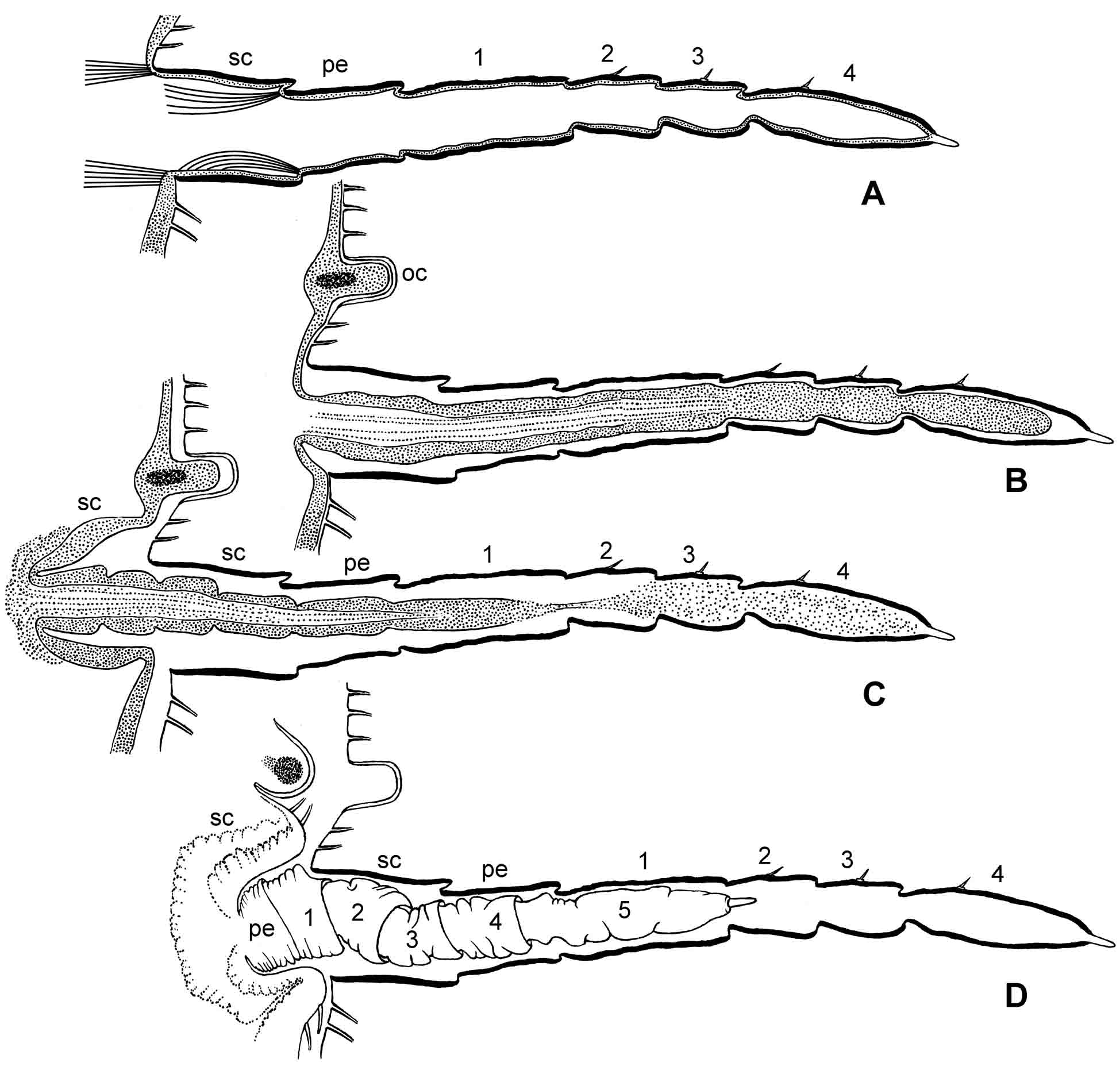 Рис. 9.12.2. Gallinsecta: Orthezia urticae (Linnaeus 1758 [Aphis]), преобразование антенны перед линькой личинки самки со второго возраста на третий (при этой линьке число флагелломеров увеличивается с четырех до пяти); продольный разрез (срез кутикулы показан черным, срез тканей пунктирован): A – до начала предлиночного процесса (мышцы показаны параллельными линиями); B – мышцы исчезли, гиподермы отслаивается от кутикулы и теряет расчленение; C – в дистальной половине ткани лизируются, в проксимальной половине возникает новое расчленение, новый скапус растет в вывернутом положении; D – перед самой линькой (старая кутикула, участок головы и новый вывернутый скапус показаны в разрезе, новый педицеллус и флагеллум показаны снаружи). Условные обозначения: 1–5 – флагелломеры; oc – глаз; sc – скапус; pe – педицеллус.
