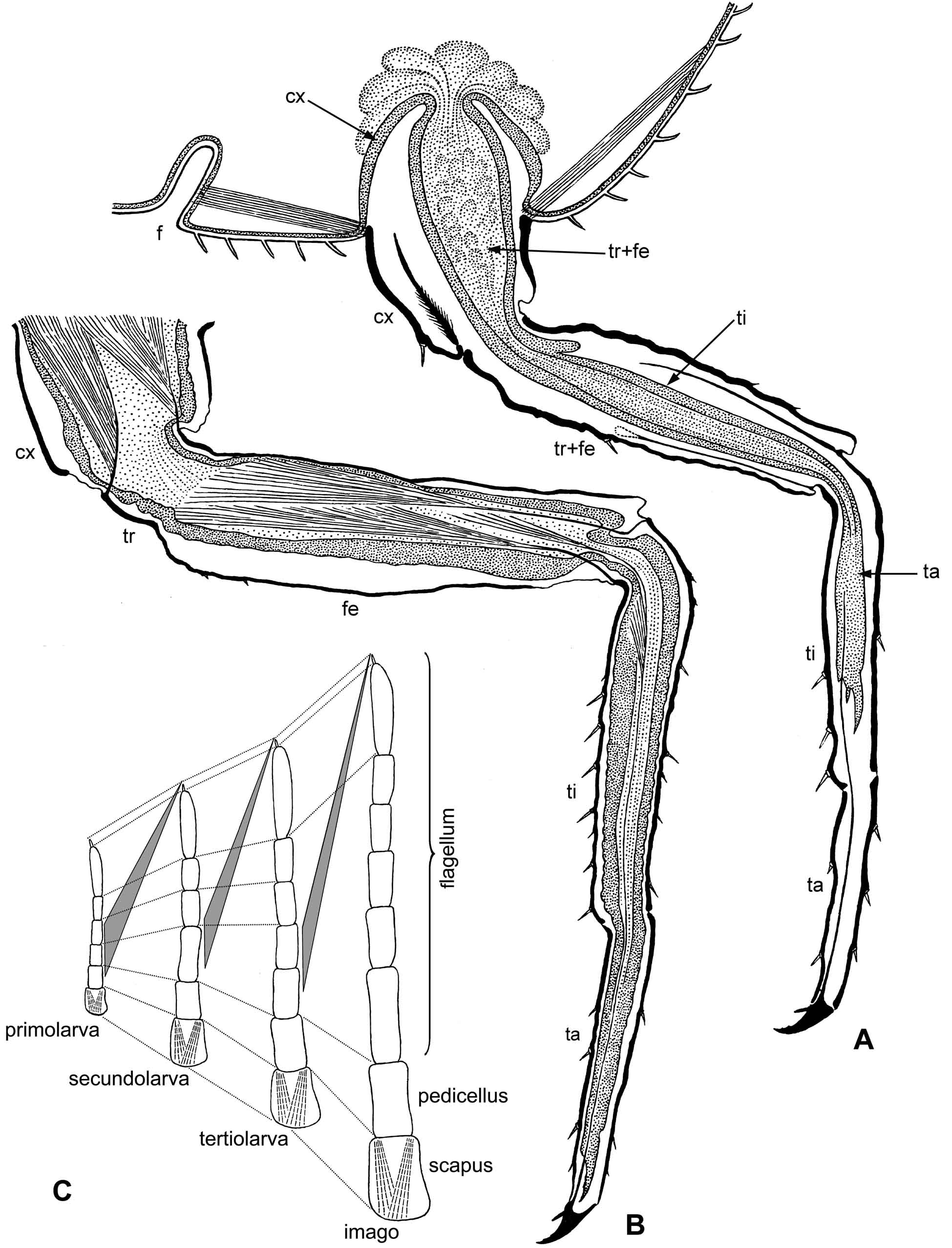 Рис. 9.12.3. Gallinsecta: Orthezia urticae (Linnaeus 1758 [Aphis]): A–B – преобразования ноги при разных линьках; продольный разрез (срез кутикулы показан черным, срез тканей пунктирован, мышцы показаны параллельными линиями). A – линька активных стадий: нога самки в середине предлиночного процесса со второго возраста на третий; B – линька покоящихся стадий: нога самца перед линькой с пенультимонимфы на ультимонимфу. C – развитие антенны у самки; точечные линии показывают филогенетическую гомологию члеников антенны, клиновидные фигуры показывают индивидуальный разброс их онтогенетической гомологии. Условные обозначения: cx – тазик; f – стернальная аподема (фурка); fe – бедро; ta – лапка; ti – голень; tr – вертлуг.