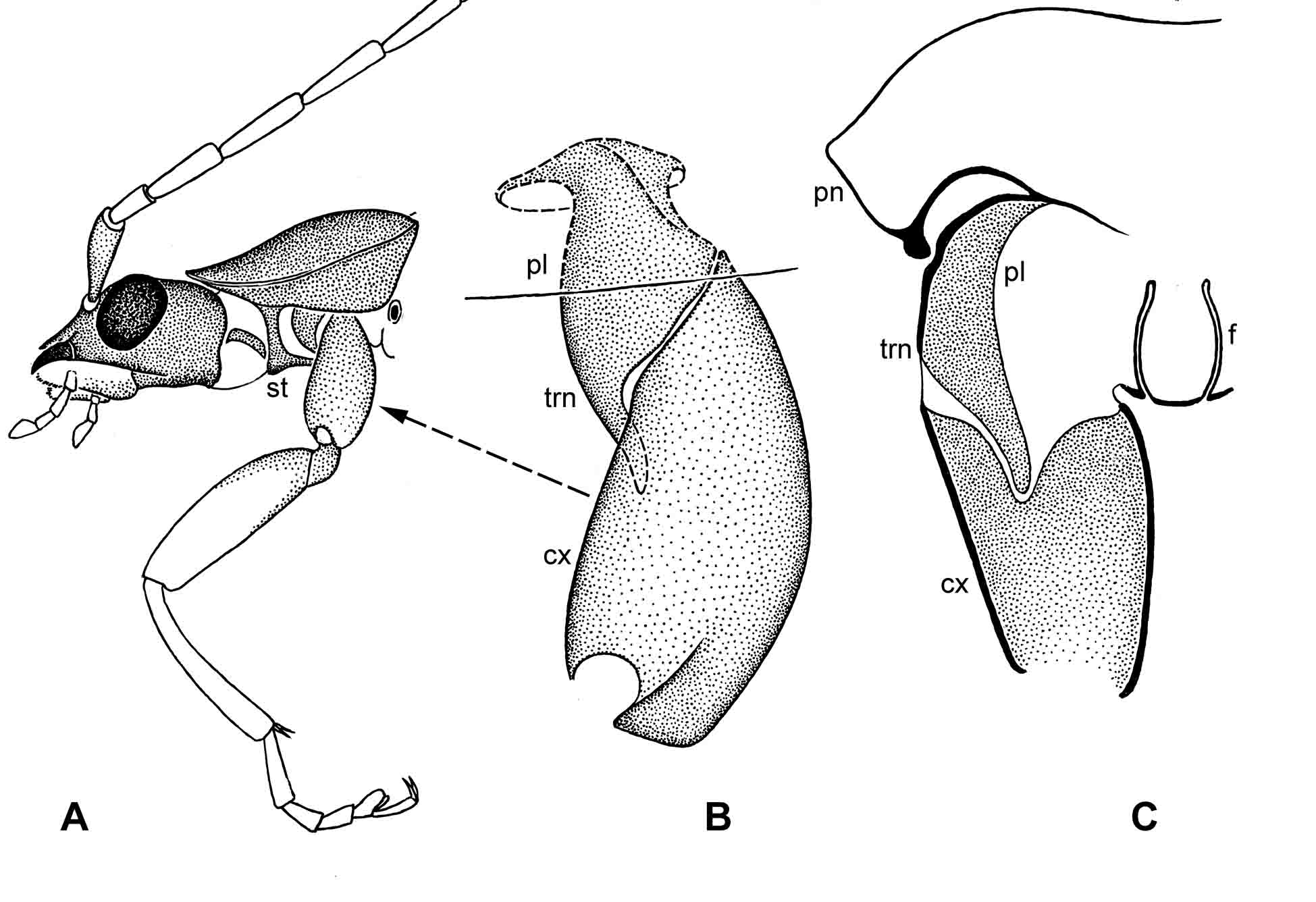 Ðèñ. 10.2.4. Eleuterata-Polyphaga: Rhagonycha fulva (Scopoli 1763 [Cantharis]). A – ãîëîâà è ïåðåäíåãðóäü (ñì. ðèñ. 10.2.3). B – óâåëè÷åííûé òàçèê è ïëåéðèò, ñëèòûé ñ òðîõàíòèíîì (ëàòåðàëüíî; íàëåãàþùèé ëàòåðàëüíûé êðàé ïðîíîòóìà ïîêàçàí ëèíèåé); C – ïîïåðå÷íûé ðàçðåç ïîëîâèíû ïåðåäíåãðóäè è ïåðåäíÿÿ ñòîðîíà òàçèêà è ïëåéðèòà ñ òðîõàíòèíîì (âèä èçíóòðè). Óñëîâíûå îáîçíà÷åíèÿ: cx – òàçèê; f – ôóðêà (ñòåðíàëüíàÿ àïîäåìà); pl – ïëåéðèò; pn – ïðîíîòóì; st – ñòåðíèò; trn – òðîõàíòèí.