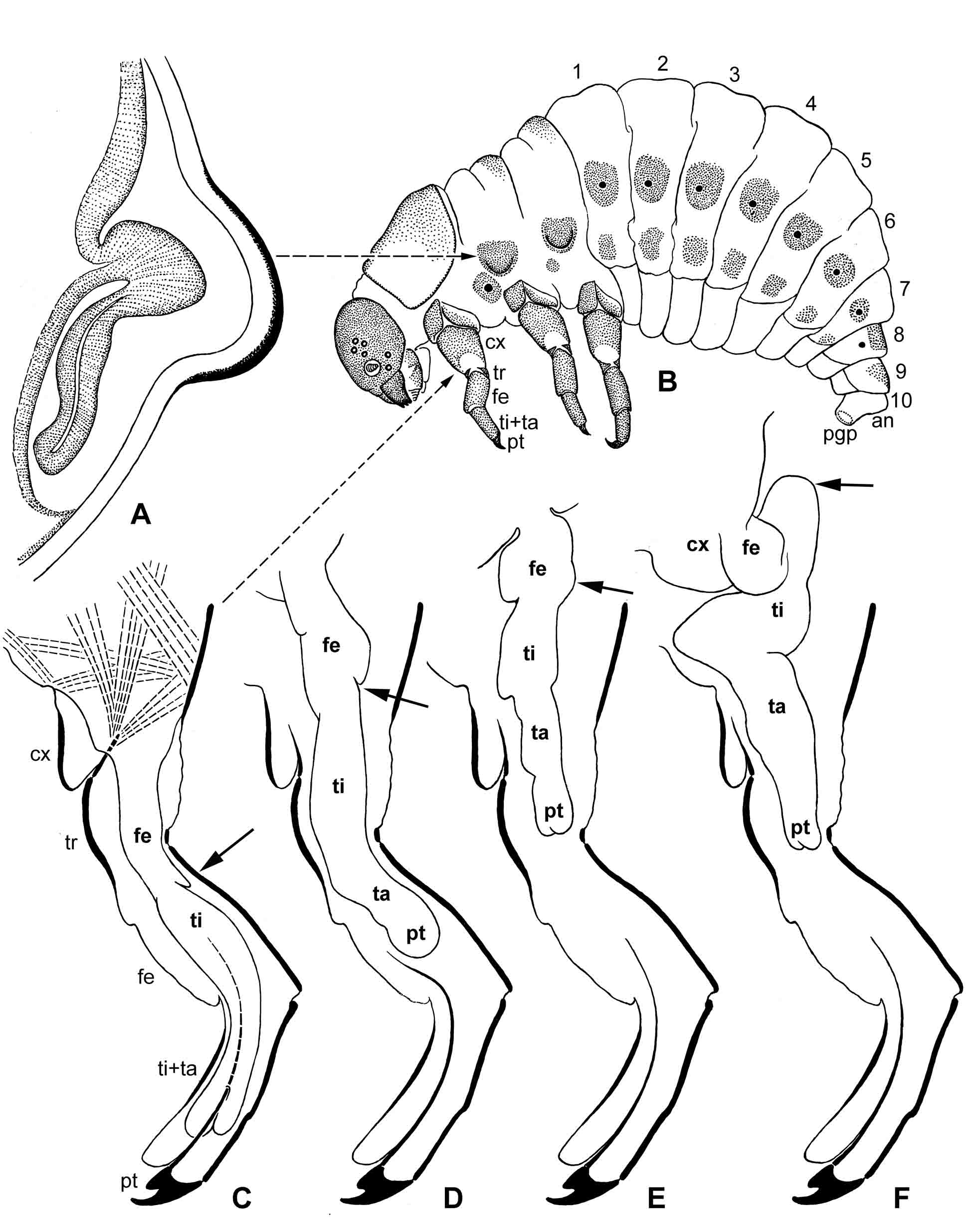 Ðèñ. 10.2.6. Ïðåâðàùåíèå ëè÷èíêè â êóêîëêó ó êîëîðàäñêîãî æóêà Leptinotarsa decemlineata (Say 1824 [Doryphora]) (Eleuterata-Polyphaga). A – ïðîíèìôà ðàííåé ôàçû, îïòè÷åñêèé ïîïåðå÷íûé ñðåç ëè÷èíî÷íîãî ïðåäøåñòâåííèêà ïðîòîïòåðîíà è íà÷àëî ðàçâèòèÿ çà÷àòêà êóêîëî÷íîãî ïðîòîïòåðîíà (ñðåç ãèïîäåðìû ïóíêòèðîâàí); B – ëè÷èíêà, ëàòåðàëüíî; C–F – îïòè÷åñêèé ñðåç ïåðåäíåé íîãè ïðîíèìô ïîñëåäîâàòåëüíûõ ôàç ðàçâèòèÿ (ôóíêöèîíèðóþùèå ïîïåðå÷íî-ïîëîñàòûå ìûøöû ïîêàçàíû ïðåðûâèñòûìè ëèíèÿìè). Óñëîâíûå îáîçíà÷åíèÿ: 1–10 – ñåãìåíòû áðþøêà; an – àíàëüíîå îòâåðñòèå; cx – òàçèê; fe – áåäðî; pgp – ïèãîïîä; ta – ëàïêà; ti – ãîëåíü; tr – âåðòëóã; æèðíûì øðèôòîì îáîçíà÷åíû ÷ëåíèêè çà÷àòêà êóêîëî÷íîé íîãè; ñâåòëûì øðèôòîì îáîçíà÷åíû êóòèêóëÿðíûå ÷ëåíèêè ëè÷èíî÷íîé íîãè; òîëñòàÿ ñòðåëêà óêàçûâàåò ïîëîæåíèå êîëåííîãî ñî÷ëåíåíèÿ ó áóäóùåé êóêîëî÷íîé íîãè. Îáúÿñíåíèå – ñì. Metabola (1Ccδ-1).