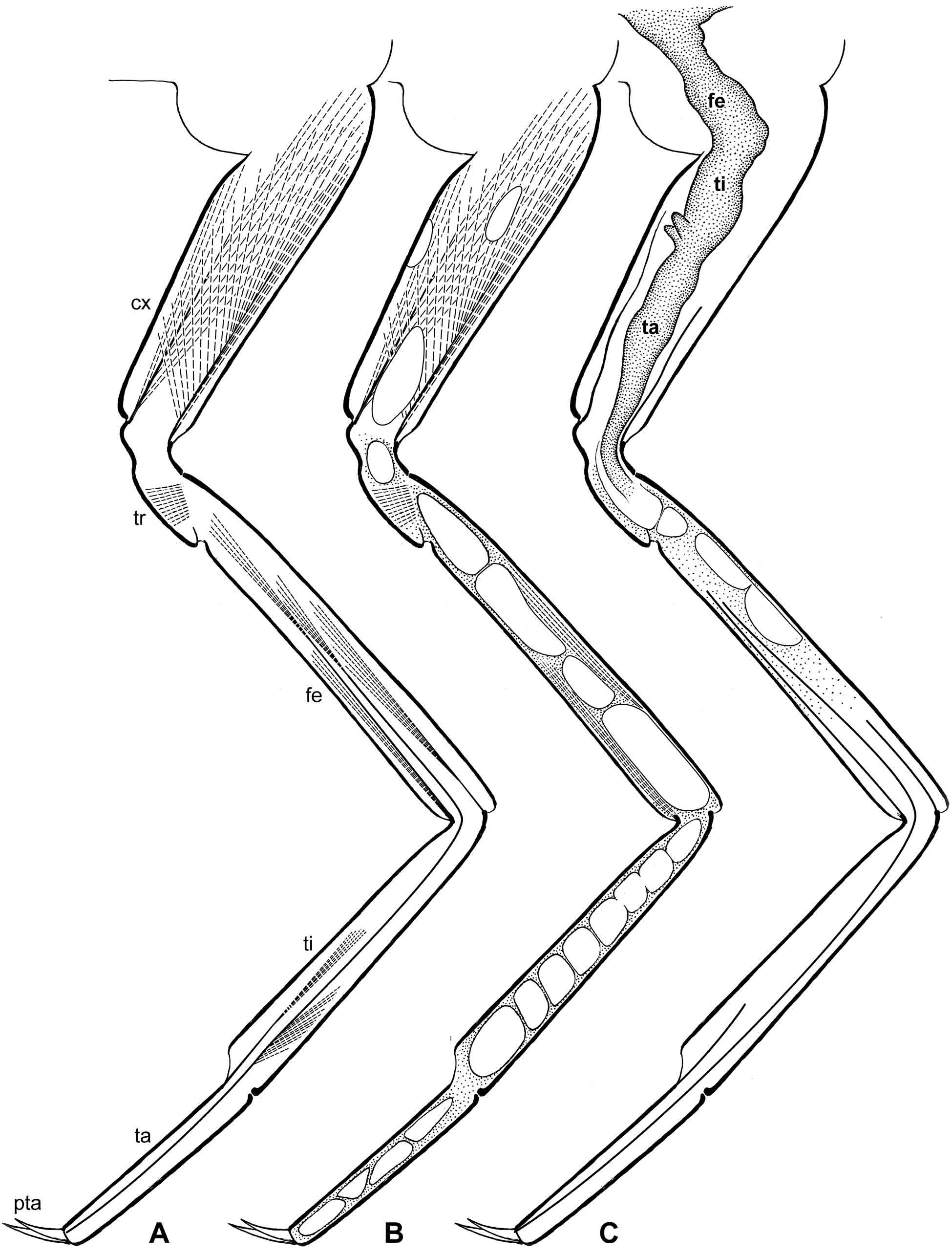 Рис. 10.2.8. Трансформация ноги при превращении личинки в куколку у жука-плавунца Dytiscus marginalis Linnaeus 1758 (Eleuterata-Adephaga). Оптические срезы задней ноги (срез личиночной кутикулы показан толстой линией; поперечно-полосатые мышцы показаны прерывистыми линиями). A – активная личинка последнего возраста; B–C – пронимфы последовательных фаз развития. Условные обозначения: cx – тазик; fe – бедро; pta – претарсус; ta – лапка; ti – голень; tr – вертлуг; жирным шрифтом обозначены членики зачатка куколочной ноги; светлым шрифтом обозначены кутикулярные членики личиночной ноги. Объяснение – см. Metabola (1Ccδ-2).