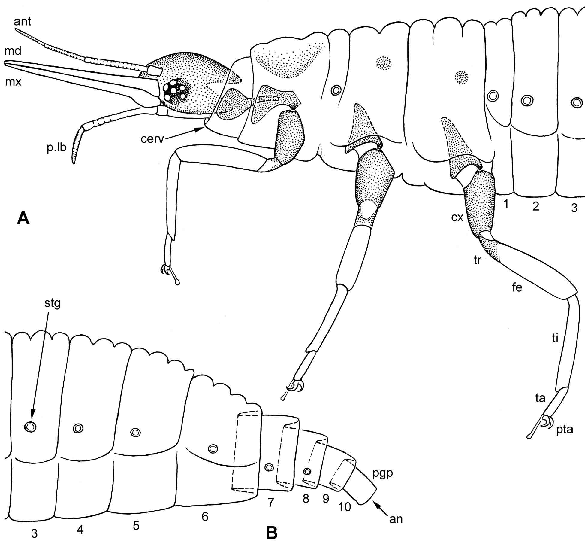Ðèñ. 10.4.4. Chrysoperla carnea (Stephens 1836 [Chrysopa]), ëè÷èíêà. Óñëîâíûå îáîçíà÷åíèÿ: 1–10 – ñåãìåíòû áðþøêà; an – àíàëüíîå îòâåðñòèå; ant – àíòåííà; cerv – øåéíàÿ ñêëàäêà ñ ïàðíûì öåðâèêàëüíûì ñêëåðèòîì; cx – òàçèê; fe – áåäðî; md – ìàíäèáóëà; pgp – ïèãîïîä; p.lb – ëàáèàëüíûé ùóïèê; pta – ïðåòàðñóñ; stg – äûõàëüöå; ta – ëàïêà; ti – ãîëåíü; tr – âåðòëóã.