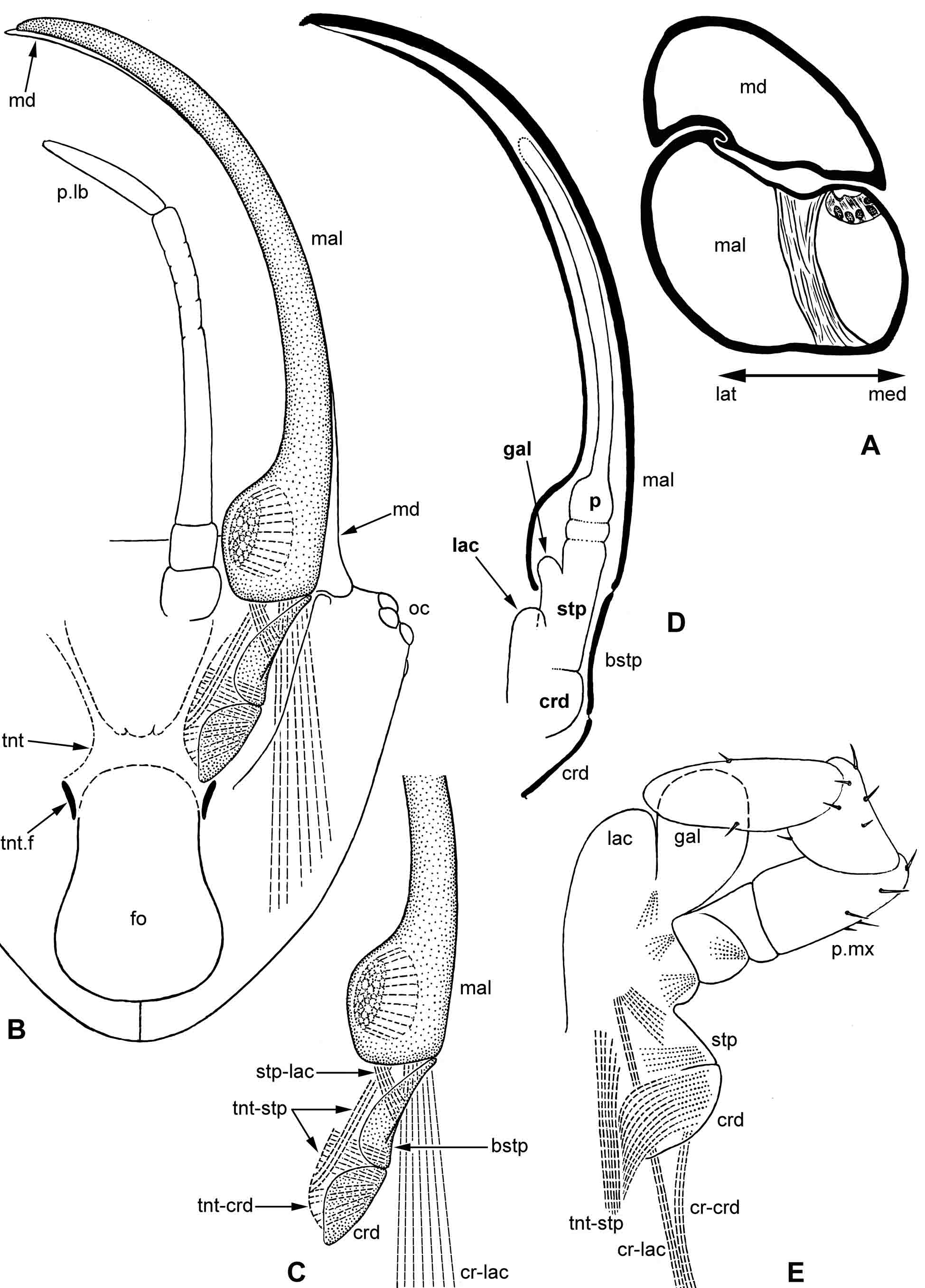 Ðèñ. 10.4.5. Birostrata. Chrysoperla carnea (Stephens 1836 [Chrysopa]): ìàêñèëëà ëè÷èíêè è êóêîëêè. A – ïîïåðå÷íûé ðàçðåç ìàíäèáóëû è ìàêñèëëû ëè÷èíêè (ëàòåðàëüíàÿ ñòîðîíà ñëåâà, ìåäèàëüíàÿ ñïðàâà) (ïî Gaumont 1976); B–Ñ – ìàêñèëëà ëè÷èíêè, âåíòðàëüíî: ëåâàÿ ïîëîâèíà ãîëîâû àêòèâíîé ëè÷èíêè (òîëüêî ìàêñèëëÿðíûå ñêëåðèòû ïóíêòèðîâàíû; òåíòîðèóì è ìàêñèëëÿðíûå ìûøöû ïîêàçàíû ïðåðûâèñòûìè ëèíèÿìè; äðóãèå ìûøöû íå íàðèñîâàíû); D – îïòè÷åñêèé ñðåç ìàêñèëëû ïðîíèìôû (÷åðíîå – îïòè÷åñêèé ñðåç ëè÷èíî÷íîé êóòèêóëû; òîíêàÿ ëèíèÿ – î÷åðòàíèÿ ãèïîäåðìû, ïðèîáðåòàþùåé ôîðìó áóäóùåé êóêîëî÷íîé ìàêñèëëû; ÷àñòè áóäóùåé êóêîëî÷íîé ìàêñèëëû ïîäïèñàíû æèðíûì øðèôòîì); E – ìàêñèëëà êóêîëêè (çà÷àòêè èìàãèíàëüíûõ ìûøö ïîêàçàíû ïðåðûâèñòûìè è ïóíêòèðíûìè ëèíèÿìè). Óñëîâíûå îáîçíà÷åíèÿ: bspt – áàçèñòèïåñ; cr-crd – ìûøöà îò êðàíèóìà ê êàðî; cr-lac – ìûøöà îò êðàíèóìà ê ëàöèíèè; crd – êàðäî; fo – çàòûëî÷íîå îòâåðñòèå; gal – ãàëåà; lac – ëàöèíèÿ; mal – ìàêñèëëÿðíàÿ ìàëà (ðåçóëüòàò ñëèÿíèÿ äèñòàëüíîé ÷àñòè ñòèïåñà, ëàöèíèè, ãàëåè è ùóïèêà); md – ìàíäèáóëà; oc – ñòåììû (äåðèâàò ôàñåòî÷íîãî ãëàçà); p – ìàêñèëëÿðíûé ùóïèê; p.lb – ëàáèàëüíûé ùóïèê; p.mx – ìàêñèëëÿðíûé ùóïèê; stp – ñòèïåñ; stp-lac – ìûøöà îò ñòèïåñà ê ëàöèíèè; tnt – òåíòîðèóì; tnt.f – çàäíÿÿ òåíòîðèàëüíàÿ ÿìêà; tnt-crd – ìûøöà îò òåíòîðèóìà ê êàðäî; tnt-stp – ìûøöà îò òåíòîðèóìà ê ñòèïåñó.