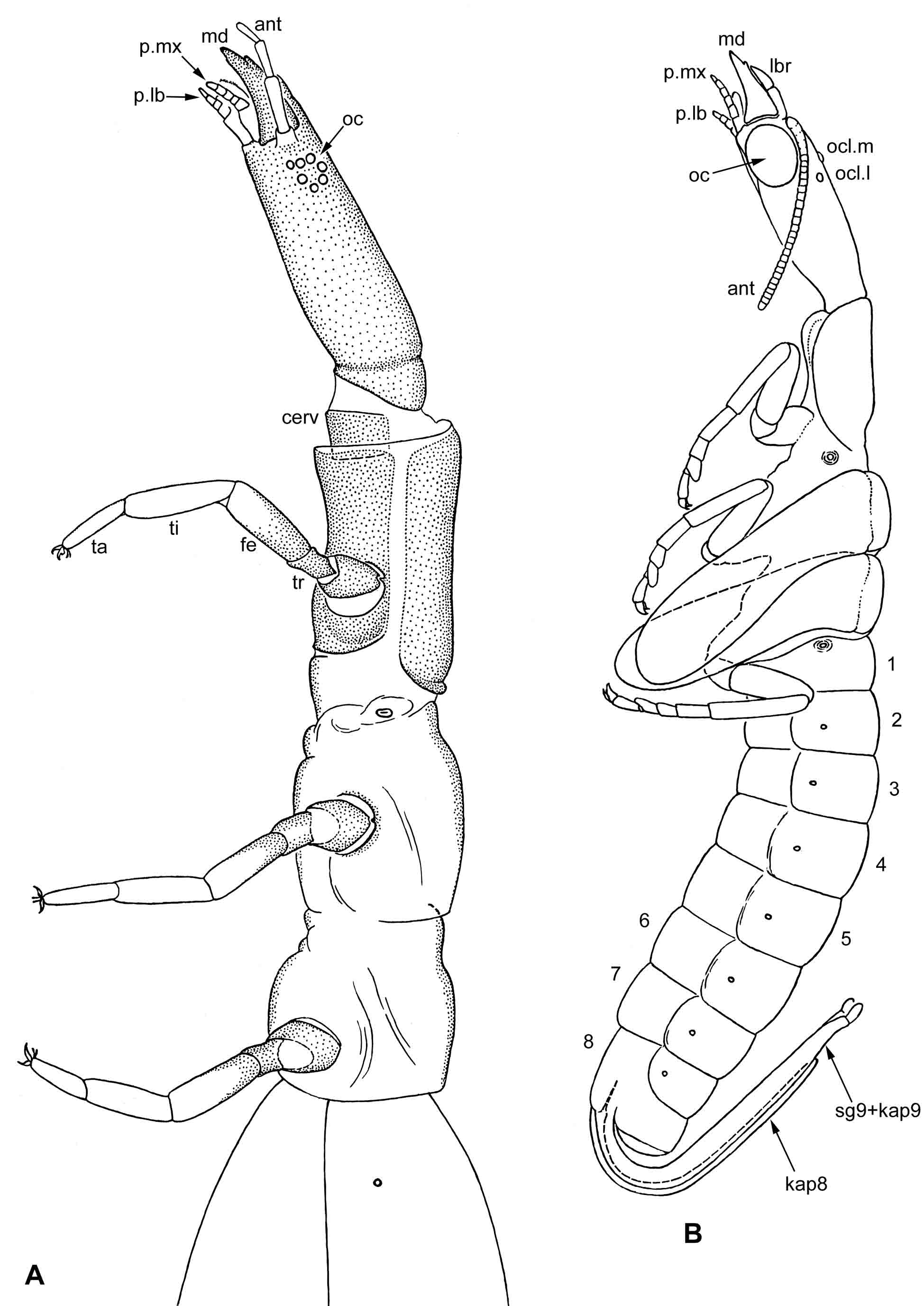 Ðèñ. 10.5.2. Rhaphidioptera: Raphidia sp. A – ïåðåäíÿÿ ÷àñòü òåëà ëè÷èíêè; B – êóêîëêà. Óñëîâíûå îáîçíà÷åíèÿ: 1–8 – ñåãìåíòû áðþøêà; ant – àíòåííà; cerv – öåðâèêàëüíûé (øåéíûé) ñêëåðèò; fe – áåäðî; kap8 – ñëèòûå êèíåòàïîôèçû VIII ïàðû (âåíòðàëüíàÿ ñòâîðêà ÿéöåêëàäà); lbr – âåðõíÿÿ ãóáà; md – ìàíäèáóëà; oc – ãëàç; ocl.l – ëàòåðàëüíûé ïðîñòîé ãëàçîê; ocl.m – ìåäèàëüíûé ïðîñòîé ãëàçîê; p.lb – ëàáèàëüíûé ùóïèê; p.mx – ìàêñèëëÿðíûé ùóïèê; sg9+kap9 – ñëèòûå ñòèëèãåð è êèíåòàïîôèçû IX ñåãìåíòà áðþøêà (äîðñàëüíàÿ ñòâîðêà ÿéöåêëàäà); ta – ëàïêà; ti – ãîëåíü; tr – âåðòëóã.