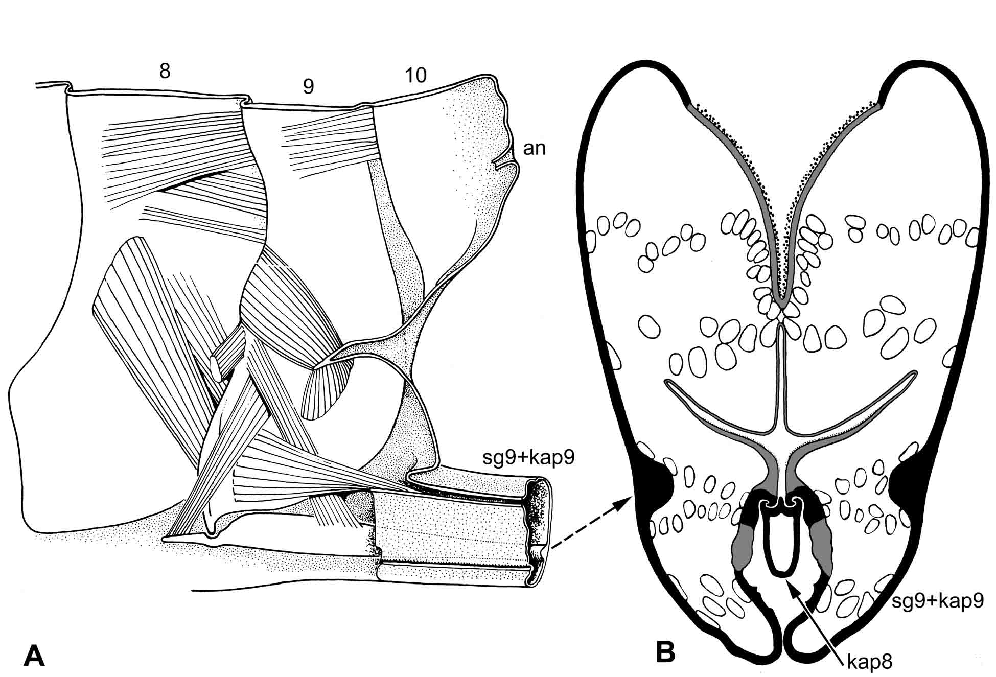 Рис. 10.5.4. Rhaphidioptera. Raphidia sp.: детали строения яйцеклада (по Mickoleit 1973b, упрощено). A – медиальный срез вершины брюшка и основания яйцеклада (мембраны пунктированы, склериты белые); B – поперечный срез яйцеклада (склеротизованная кутикула показана черным, эластичная кутикула серым, поперечные срезы косых мышц показаны овалами). Условные обозначения: 8–10 – сегменты брюшка; an – анальное отверстие; kap8 – слитые кинетапофизы VIII пары (вентральная створка яйцеклада); sg9+kap9 – слитые стилигер и кинетапофизы IX сегмента брюшка (дорсальная створка яйцеклада).