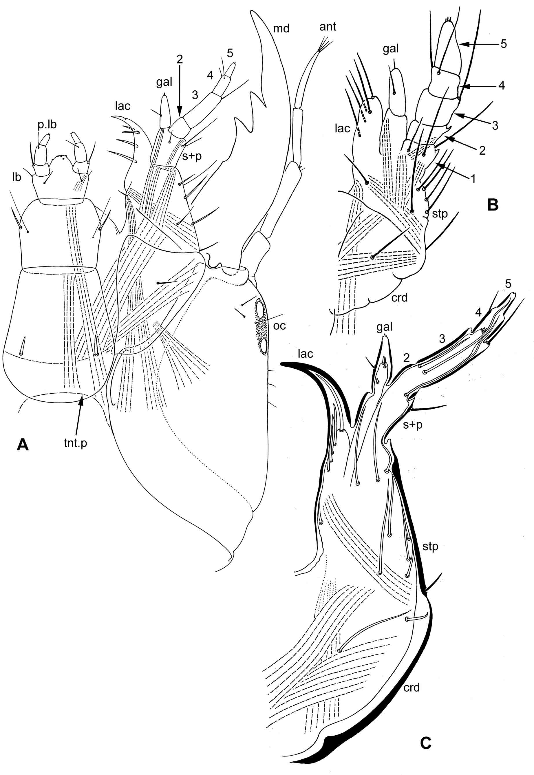 Рис. 10.6.4. Meganeuroptera-Nothomegaloptera. Sialis sordida Klingstedt 1932: максилла личинки и куколки. A – часть головы личинки, вентрально (тенториум, лабиальные и максиллярные мышцы показаны прерывистыми линиями; другие мышцы не показаны). B – максилла куколки, вентрально (мышцы показаны прерывистыми линиями). C – максилла пронимфы, оптический срез (личиночная кутикула показана черным как оптический срез; будущая куколочная максилла показана с вентральной стороны; сохранившиеся и частично дегенерировавшие мышцы показаны прерывистыми и пунктирными линиями соответственно). Условные обозначения: 1–5 – членики максиллярного щупика; ant – антенна; crd – кардо; lac – лациния максиллы; lb – нижняя губа; gal – галеа максиллы; lb – нижняя губа; md – мандибула; oc – стеммы сложного глаза; p.lb – лабиальный щупик; s+p – членик, образованный слиянием первого членика максиллярного щупика с дистальным выступом стипеса; stp – стипес; tnt.p – задний тенториальный мост.