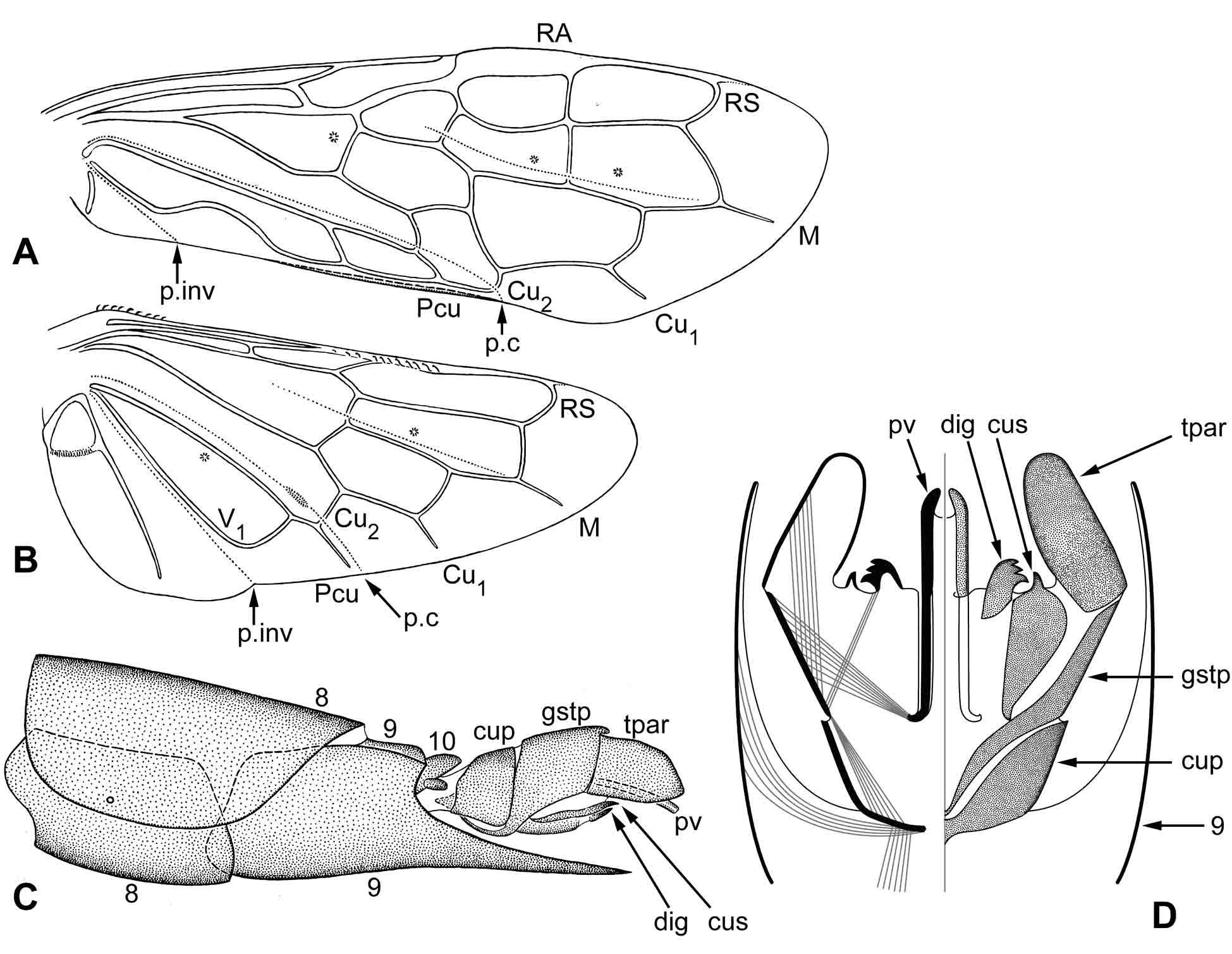 Ðèñ. 10.7.2. Hymenoptera-Neohymenoptera. A–B – ïåðåäíåå è çàäíåå êðûëüÿ Acantholyda sp. (ïîêàçàíû íèãìû). Ñ – âåðøèíà áðþøêà ñàìöà Sirex noctulio Fabricius 1793, ãåíèòàëèè íååñòåñòâåííî âûäâèíóòû; D – ñõåìà ñòðîåíèÿ ãåíèòàëèé òîãî æå âèäà, ñëåâà â ðàçðåçå (ìûøöû ïîêàçàíû ñåðûì), ñïðàâà âåíòðàëüíî (ñêëåðèòû çàòåìíåíû, IX ñòåðíèò áðþøêà â ðàçðåçå). Óñëîâíûå îáîçíà÷åíèÿ: 8–10 – ñåãìåíòû áðþøêà; cup – êóïóëà; cus – êóñïèñ; dig – äèãèòóñ; gstp – ãîíîñòèïåñ; p.c – êëàâàëüíàÿ áîðîçäà; p.inv – èíâåðòàëÿðíàÿ ñêëàäêà; pv – ïåíèñâàëüâà; tpar – òåëîïàðàìåð.