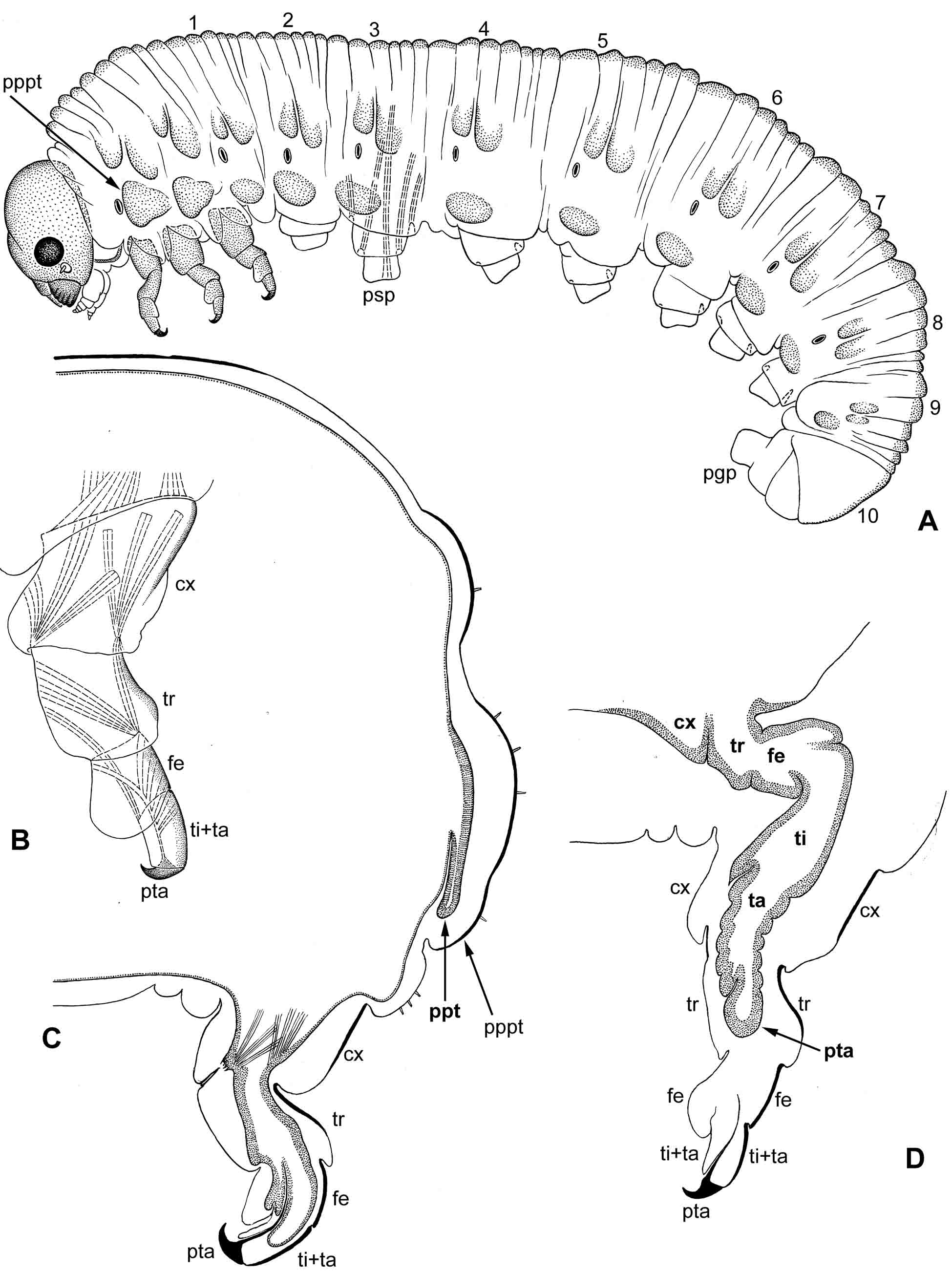 Ðèñ. 10.7.3. Hymenoptera. Diprion pini (Linnaeus 1758 [Tenthredo]). A – ëè÷èíêà (ïðåðûâèñòûìè ëèíèÿìè ïîêàçàíû ìûøöû ëîæíîíîæêè III ñåãìåíòà áðþøêà); B – íîãà ëè÷èíêè (ïðåðûâèñòûìè ëèíèÿìè ïîêàçàíû ìûøöû); Ñ – ïîïåðå÷íûé ðàçðåç ïîëîâèíû ñðåäíåãðóäè ïðîíèìôû âî âðåìÿ íà÷àëà óêîðî÷åíèÿ ãèïîäåðìû íîãè (ãèïîäåðìà ïóíêòèðîâàíà); D – ñðåç íîãè íà áîëåå ïîçäíåé ñòàäèè (æèðíûì øðèôòîì ïîäïèñàíû ÷ëåíèêè çà÷àòêà êóêîëî÷íîé íîãè; ñâåòëûì øðèôòîì ïîäïèñàíû êóòèêóëÿðíûå ÷ëåíèêè ëè÷èíî÷íîé íîãè). Óñëîâíûå îáîçíà÷åíèÿ: 1–10 – ñåãìåíòû áðþøêà; cx – òàçèê; fe – áåäðî; pgp – ïàðíûé ïèãîïîä; psp – ïàðíàÿ ëîæíîíîæêà; ppt – çà÷àòîê êóêîëî÷íîãî ïðîòîïòåðîíà; pppt – ëè÷èíî÷íûé ïðåäøåñòâåííèê ïðîòîïòåðîíà; pt – ïðåòàðñóñ; ta – ëàïêà; ti – ãîëåíü; tr – âåðòëóã. Îáúÿñíåíèå – ñì. Metabola (1Ccδ-8).