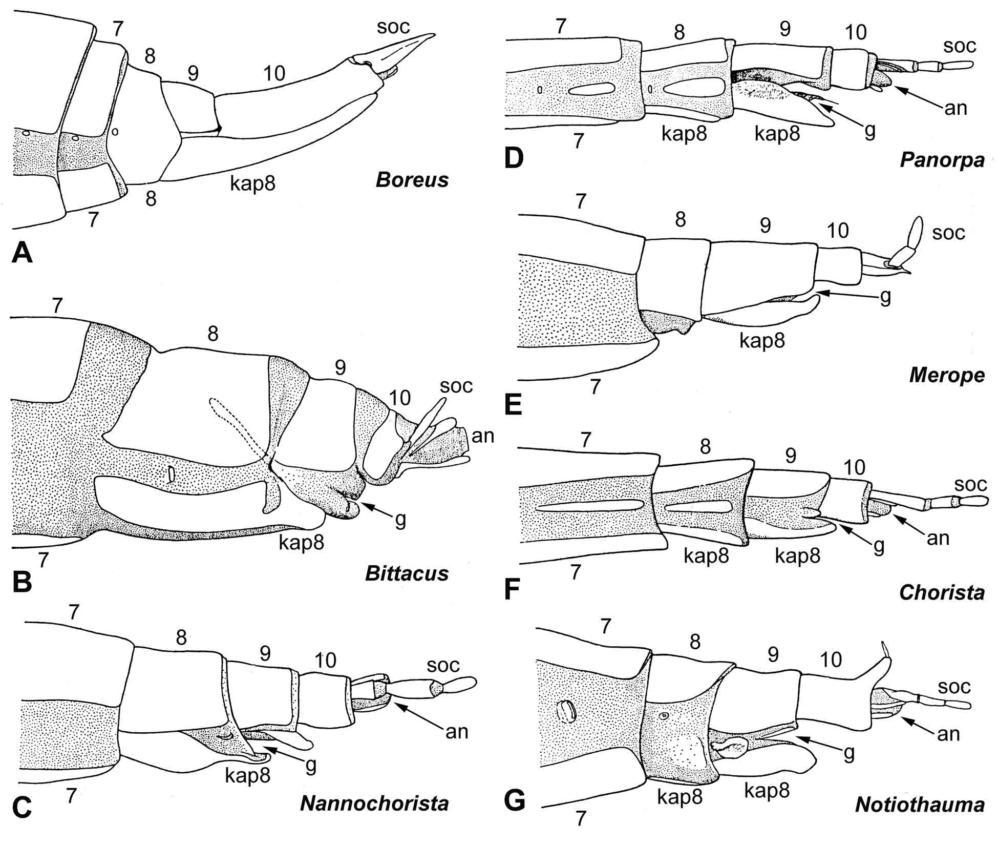 Ðèñ. 10.8.2. Enteracantha. Âåðøèíà áðþøêà ñàìîê ñêîðïèîííèö (ïî Mickoleit 1975): A – Raphioptera: Boreus hiemalis (Linnaeus 1767); B – Metamecoptera: Bittacus chlorostigma MacLachlan 1881; C – Nannomecoptera: Nannochorista dipteroides Tillyard 1917; D–G – Scorpiomuscae: D – Panorpa communis Linnaeus 1758; E – Merope tuber Newman 1838; F – Chorista australis Klug 1838; G – Notiothauma reedi MacLachlan 1877. Óñëîâíûå îáîçíà÷åíèÿ: 7–10 – VII–X óðîìåðû; an – àíàëüíîå îòâåðñòèå; g – ïîëîâîå îòâåðñòèå; kap8 – ñêëåðèòû, îáðàçîâàâøèåñÿ èç êèíåòàïîôèçîâ VIII óðîìåðà; soc – ñîöèè.