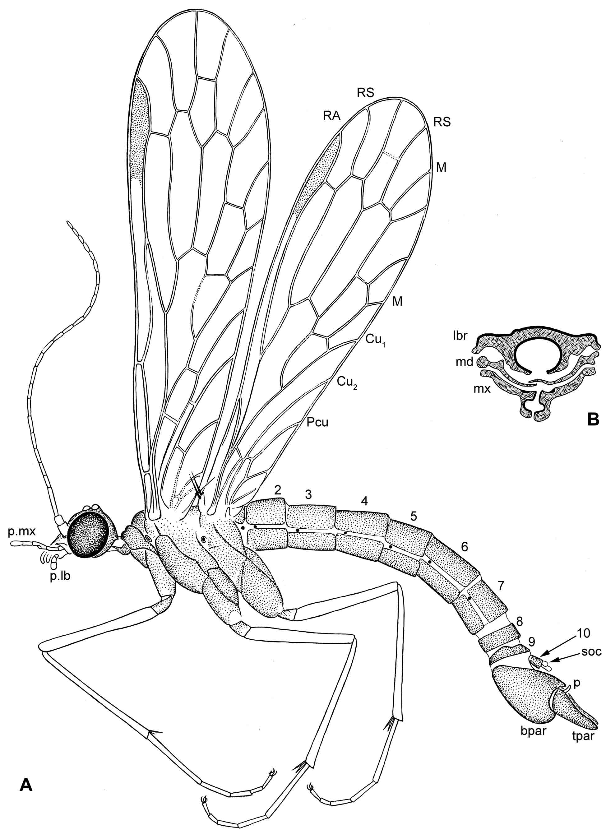 Ðèñ. 10.11.1. Nannomecoptera. A – Nannochorista dipteroides Tillyard 1917, ñàìåö èìàãî; B – ïîïåðå÷íûé ðàçðåç ñîñóùåãî ðîòîâîãî àïïàðàòà Nannochorista neotropica Navás 1928 (ðèñóíîê ïî ôîòîãðàôèè èç Beutel & Baum 2008). Óñëîâíûå îáîçíà÷åíèÿ: 1–10 – ñåãìåíòû áðþøêà; bpar – áàçèïàðàìåð; lac – ëàöèíèÿ ìàêñèëëû; lbr – âåðõíÿÿ ãóáà; md – ìàíäèáóëà; p – ïåíèñ; p.lb – ëàáèàëüíûé ùóïèê; p.mx – ìàêñèëëÿðíûé ùóïèê; soc – ñîöèÿ; tpar – òåëîïàðàìåð.