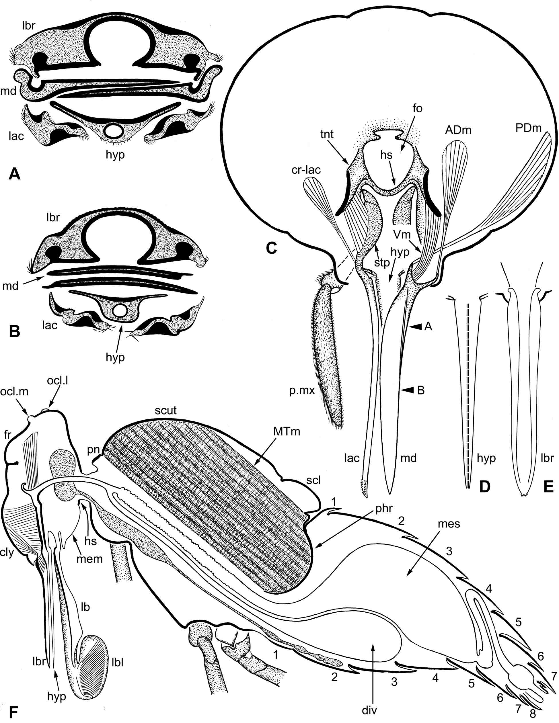 Рис. 10.14.2. Diptera: самка имаго слепня Chrysops viduatus (Fabricius 1794 [Tabanus]). A, B – срезы кровососательного хоботка на уровнях «A» и «B» на рисунке C; C – задняя стенка головной капсулы, вид спереди (изнутри), с гипофаринксом, левой мандибулой (на правой стороне рисунка) и правой максиллой (на левой стороне рисунка) (левая максилла, правая мандибула, верхняя губа, глотка и нижняя губа удалены); D – гипофаринкс (слюнной канал показан прерывистой линией); E – верхняя губа с задней (вентральной) стороны (пара внутренних склеротизованных балок показана толстыми прерывистыми линиями); F – продольный разрез во время кровососания (нервная система пунктирована, из мышц нарисованы только продольная спинная мышца среднегруди (MTm) и наиболее медиальные мышцы переднего и заднего глоточных насосов (см. также рис. 10.14.1B). Условные обозначения: 1–8 – сегменты брюшка; ADm – передняя дорсальная мышца мандибулы; scut – скутум среднегруди; cly – клипеус; cr-lac – кранио-лациниальная мышца максиллы; div – дивертикул передней кишки (зоб), наполненный нектаром; fo – затылочное отверстие; fr – лоб; hs – гипостомальный мост; hyp – гипофаринкс со слюнным каналом; lac – лациния максиллы; lb – нижняя губа; lbl – лабеллум (псевдотрахеи показаны параллельными линиями); lbr – верхняя губа с пищевым каналом; md – мандибула; mem – мембранозная поверхность между стипесами максилл; mes – полость средней кишки, частично наполненная кровью; MTm – продольная спинная мышца среднегруди; ocl.l – латеральный простой глазок; ocl.m – медиальный простой глазок; PDm – задняя дорсальная мышца мандибулы; phr – фрагма между мезо- и метанотумом; p.mx – максиллярный щупик; pn – пронотум; scl – скутеллум среднегруди; stp – стипес максиллы; tnt – фрагмент тенториума; Vm – вентральная мышца мандибулы.