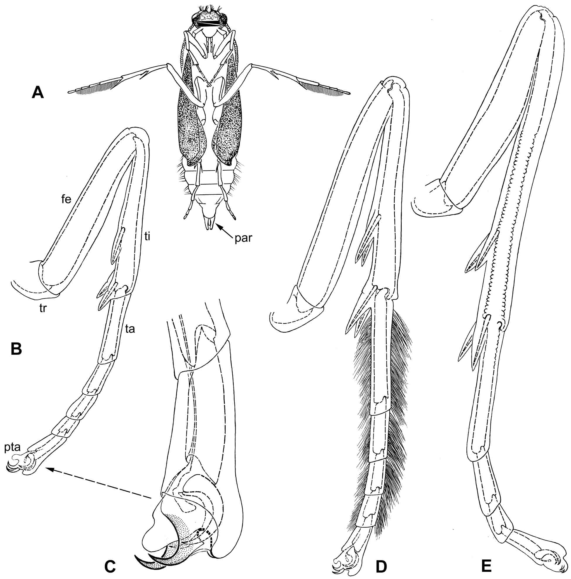 Рис. 10.15.4. Trichoptera: A – Rhyacophila sp. активно плавающая куколка (фаратное имаго) самца, вентрально (по F. Brocher, из Grassé 1951, с исправлениями); B–E – Rhyacophila nubila Zetterstedt 1840, ноги куколки перед линькой на имаго (имагинальная кутикула, находящаяся под куколочной, показана прерывистой линией): B–C – передняя нога, D – средняя нога, E – задняя нога. Условные обозначения: fe – бедро; par – зачатки парамеров; pta – претарсус; ta – лапка; ti – голень; tr – вертлуг.